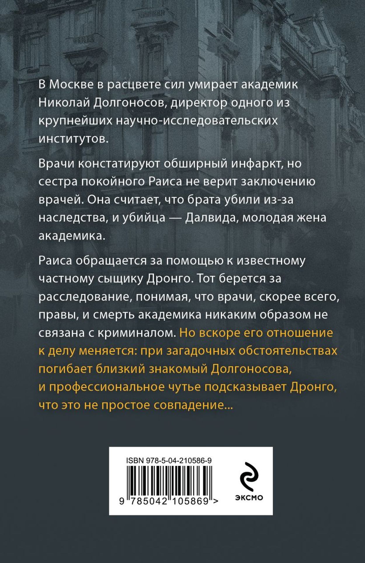 In Moscow, Academician Nikolai Dolgonosov, director of one of the largest research institutes, dies in his prime. Doctors confirm a massive heart attack, but the deceased's sister Raisa does not believe the doctors' conclusion. She believes that her brother was killed for an inheritance, and the killer is Dalvida, the academician's young wife. Raisa turns to the famous private detective Drongo for help. He takes on the investigation, realizing that the doctors are most likely right and the academician's death is in no way connected with crime. But soon his attitude to the case changes: a close acquaintance of Dolgonosov dies under mysterious circumstances, and Drongo's professional intuition tells him that this is not a simple coincidence...