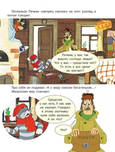 Winter in Prostokvashino is snowy, the snowdrifts are higher than your head. And Sharik and Matroskin are quarreling and being naughty, arguing over who should close the door to the house. The stove is not heated, so the hut is colder than outside. Suddenly, Uncle Fyodor comes to celebrate the New Year! There is no time for quarrels, it is necessary that the house was warm, clean and cozy. Then mom will come too. Read Eduard Uspensky's fabulous story "Winter in Prostokvashino" with pictures from the famous cartoon of the same name!
