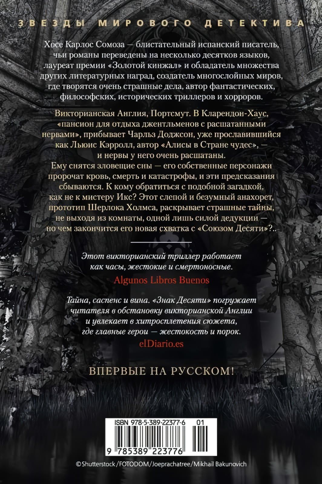 Victorian England, Portsmouth. At Clarendon House, "a boarding house for the rest of gentlemen with frayed nerves", a new guest arrives - Charles Dodgson, already famous as Lewis Carroll, author of "Alice in Wonderland" - and his nerves are very frayed. Charles Dodgson has ominous dreams - his own characters prophesize blood, death and disasters of unclear nature to him and his acquaintances, and these predictions come true again and again. Who better to turn to with such a mystery than Mr. X, who understands the background of all human actions? This blind and mad anachronist, the singer of rationality, the prototype of Sherlock Holmes, solves terrible mysteries from the comfort of his room by the power of deduction alone - but how will his new battle with the Union of Ten end? Jose Carlos Somoza is a brilliant Spanish writer whose novels have been translated into dozens of languages, winner of the Golden Dagger Award and many other literary awards, creator of multi-layered worlds where very scary things happen, author of fantasy, philosophical, historical thrillers and horror. In "The Sign of Ten", the sequel to "Etude in Black," the infernally perceptive Mr. X and his loyal, ironic, strong and sensitive nurse Anne McCarey return, and together with them in the unpredictable intrigue involved actors, prop makers and spectators of violent underground theaters, famous psychiatrists and, of course, Arthur Conan Doyle.