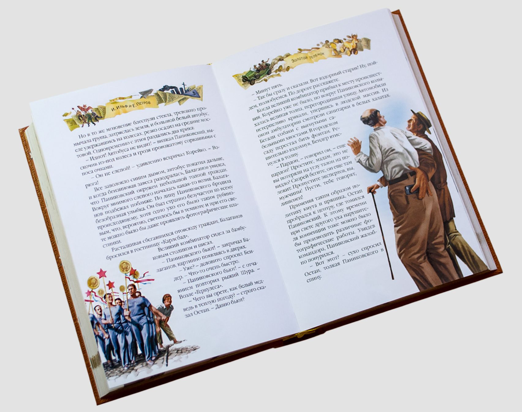 A deluxe edition with a three-sided gold border, silk ribbon, and gold embossing on the cover. These beloved characters will appear before their readers in all their glory. Dreams of distant Rio de Janeiro and white trousers will become closer to any bibliophile who owns this collector's edition of Ilf and Petrov's popular novel, addressed to all true book lovers. The continuation of the life of the "great schemer" and his sad ending, illustrated exclusively for this edition, will bring readers many pleasant moments!