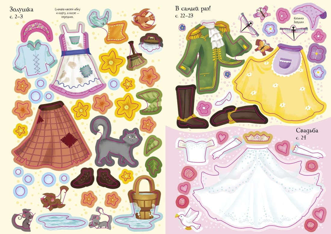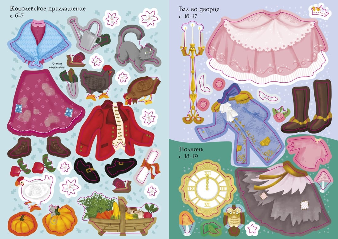 With the help of stickers think up a luxurious outfit for Cinderella, in which she will go to the ball. And then help the young prince to find his beloved. You can ride in a pumpkin carriage, dance with the prince and, of course, try on the elegant crystal slipper.