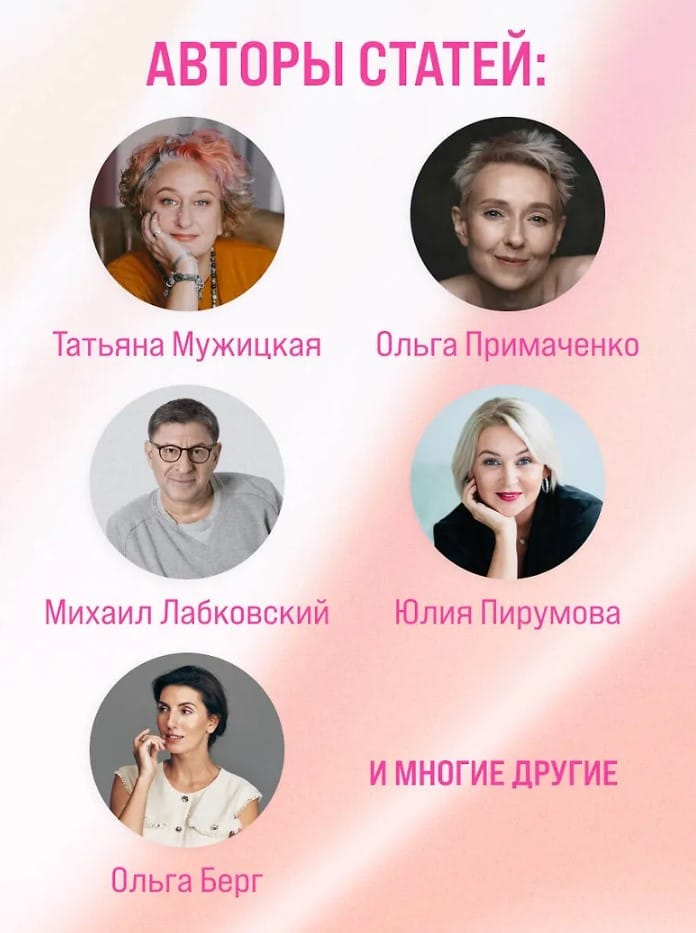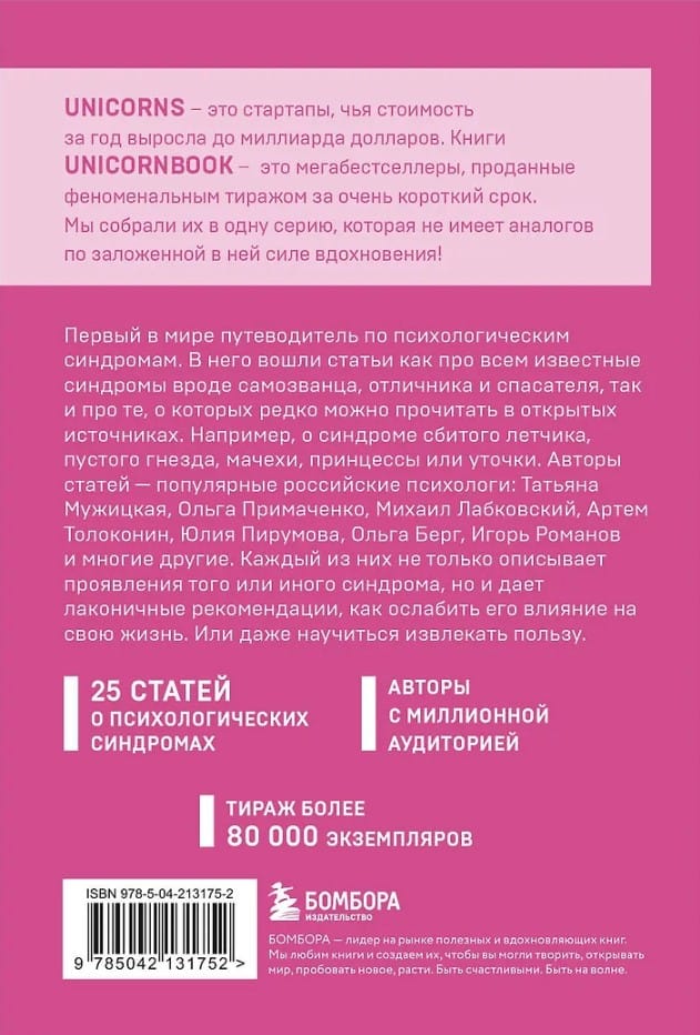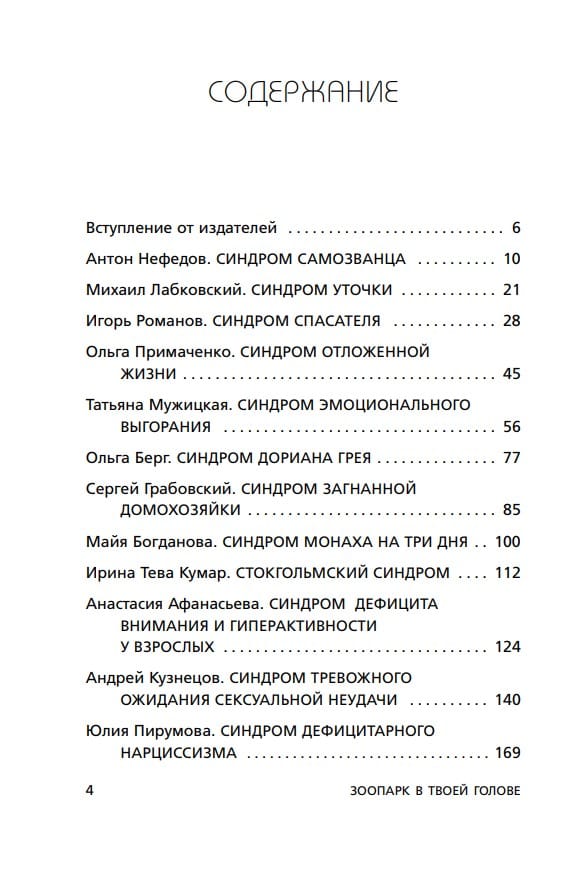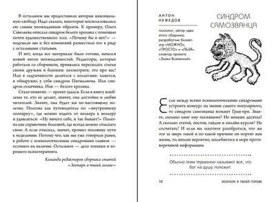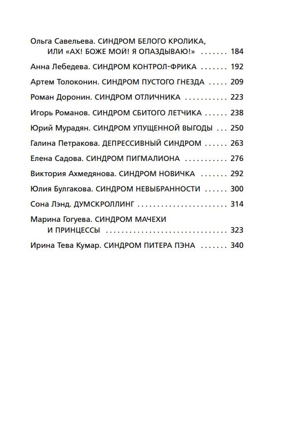The authors of the articles are popular Russian psychologists: Tatyana Muzhitskaya, Olga Primachenko, Mikhail Labkovsky, Artem Tolokonin, Yulia Pirumova, Olga Berg, Igor Romanov, and many others. Each of them not only describes the manifestations of a particular syndrome but also provides concise recommendations on how to reduce its impact on your life. Or even learn to benefit from it.