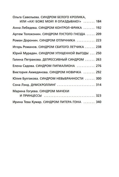 The book includes articles on well-known syndromes, such as the impostor, the straight-A student, and the rescuer, as well as those rarely discussed in open sources. For example, the downed pilot syndrome, the empty nest syndrome, the stepmother-princess syndrome, and the duck syndrome.