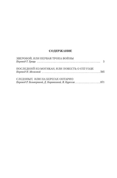 This volume includes the first three novels of the cycle, telling about the youth and mature years of Nathaniel's life, about his friendship with the Delaware Indian Chingachgook, about their skirmishes with the Hurons in the forest wilderness and on the lake surface, about the mortal risk that friends take to free Chingachgook's beloved from captivity, protect the Hutter family ("Deerslayer") and save the daughters of the British Colonel Munro ("The Last of the Mohicans"), about the love of the main character for the daughter of his old friend, Sergeant Thomas Dunham, and about his self-sacrifice for the sake of someone else's happiness ("Pathfinder").