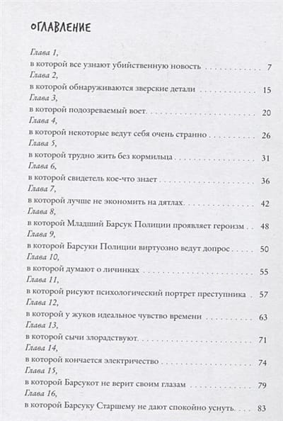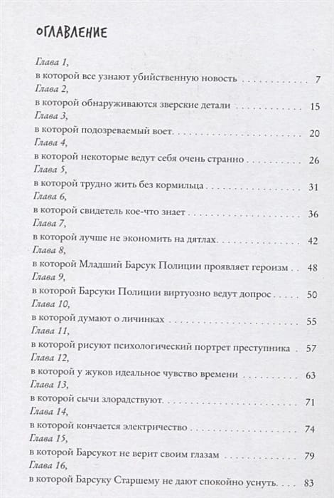 Each book is a standalone detective story, featuring the investigation led by the elderly and experienced detective Badger Senior and his assistant, the daring and reckless Badgercat.