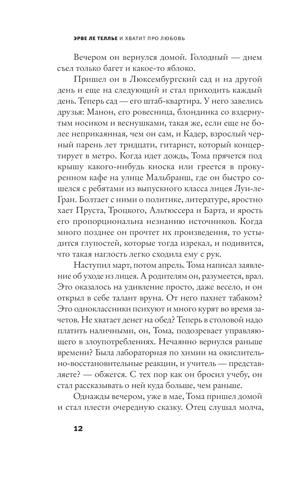 "Pietiek par mīlestību", neskatoties uz nosaukumu, ir romāns par mīlestību. Tomass Le Gāls ir psihoterapeits. Viņa paciente Anna no pirmā acu uzmetiena iemīlas rakstniekā Īvā un grasās pamest savu vīru. Pats Tomass iemīlas Luīzē, kura arī ir gatava pamest savu vīru, slavenu zinātnieku, viņa dēļ. Abām sievietēm ir relatīvi laimīga laulība un bērni. Savstarpēja kaislība, ko aizēno vainas apziņa, un identitātes meklējumi 40. dzimšanas dienas priekšvakarā liek Annai un Luīzei izdarīt izvēli: glābt ģimeni vai aizbraukt savas mīļotās dēļ. Ervē Le Teljē konstruē smalku emociju, vārdu un darbību spēli, kas līdzīga noslēpumainajiem "abhāzu domino", ko viņš izgudroja.