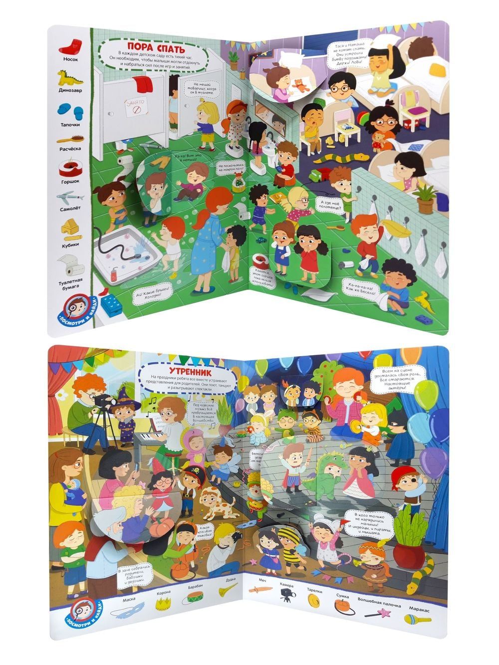Wimmelbook ar lodziņiem "Bērnudārzs" ir liela, krāsaina bilžu grāmata, kuras lappusēs bērns var visu dienu dzīvot bērnudārzā un detalizēti izpētīt, ko bērni dara dārzā, pastaigu laikā, pusdienu laikā, diendusas laikā. Viszinātkārākajiem bērniem grāmatai ir lodziņi, kas atklāj sižetu un ļauj dziļāk iegremdēties jautrajā un draudzīgajā atmosfērā. Lodziņiem ir ērts padziļinājums bērnu pirkstiņiem, lai bērnam būtu ērti tos atvērt. Grāmata ir izgatavota no bieza kartona ar laminētu vāku. Pāršķirstiet grāmatu kopā ar savu bērnu, atveriet lodziņus un dodieties uz bērnudārzu brīnišķīgā noskaņojumā!