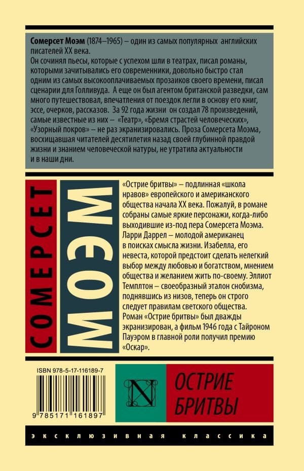 "Razor's edge" - īsta XX gadsimta sākuma Eiropas un Amerikas sabiedrības "manieru skola". Iespējams, romāns apvieno spilgtākos personāžus, kādi jebkad iznākuši Somerseta Mogema spalvai.