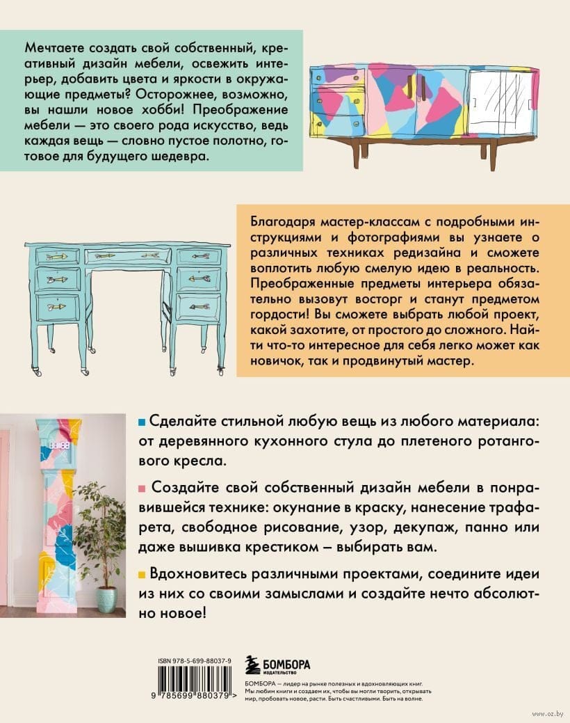 Vai jau sen esat vēlējies izveidot savu, radošu mēbeļu dizainu, atsvaidzināt interjeru, piešķirt krāsainību un spilgtumu savai apkārtnei? Uzmanieties, iespējams, ar šo grāmatu jūs atradīsiet jaunu hobiju! Mēbeļu pārveidošana ir sava veida māksla, jo katra mēbele ir kā tukšs audekls, kas gatavs nākotnes šedevram. Ir pienācis laiks padarīt savu mājokli par vietu, par kādu vienmēr esat sapņojis!