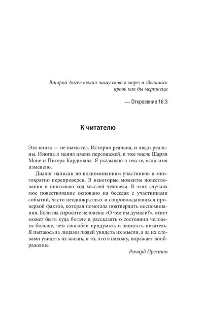 Šajā grāmatā aprakstīts stāsts par pirmā Ebolas vīrusa, kura mirstības rādītājs bija līdz pat 90 procentiem, parādīšanos un izplatīšanos. Tā ir balstīta uz patiesiem notikumiem un stāsta par to, kā cilvēce cīnījās ar iepriekš nezināmām briesmām, kādus pasākumus tā veica un kā tai izdevās apvienoties nezināmā priekšā. Šis dramatiskais stāsts ir piemērs tam, cik neaizsargāti mēs joprojām esam, lai gan kopš šiem notikumiem ir pagājušas desmitgades.
