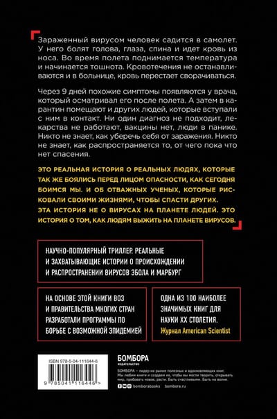 Stāsts par 20. gadsimta ļaunāko vīrusu rašanos un izplatīšanos, kas uzreiz kļuva par bestselleru. Pamatojoties uz to, PVO un daudzu valstu valdības ir publicējušas ieteikumus un aizsardzības metodes.