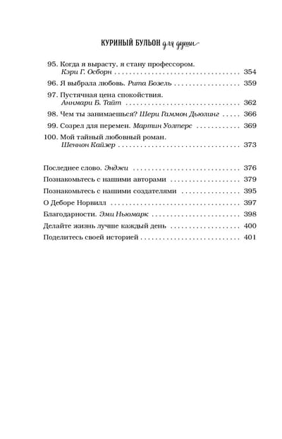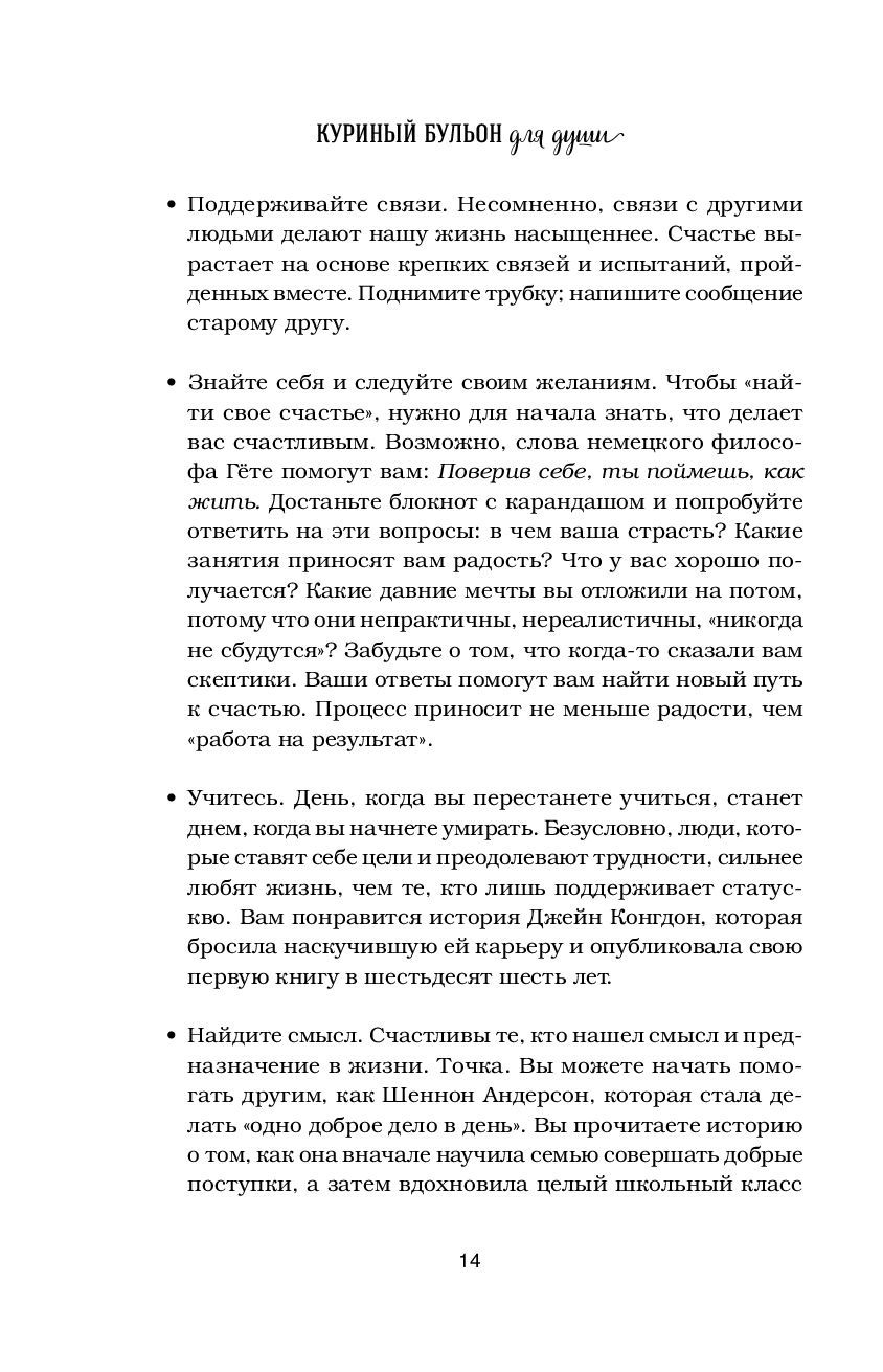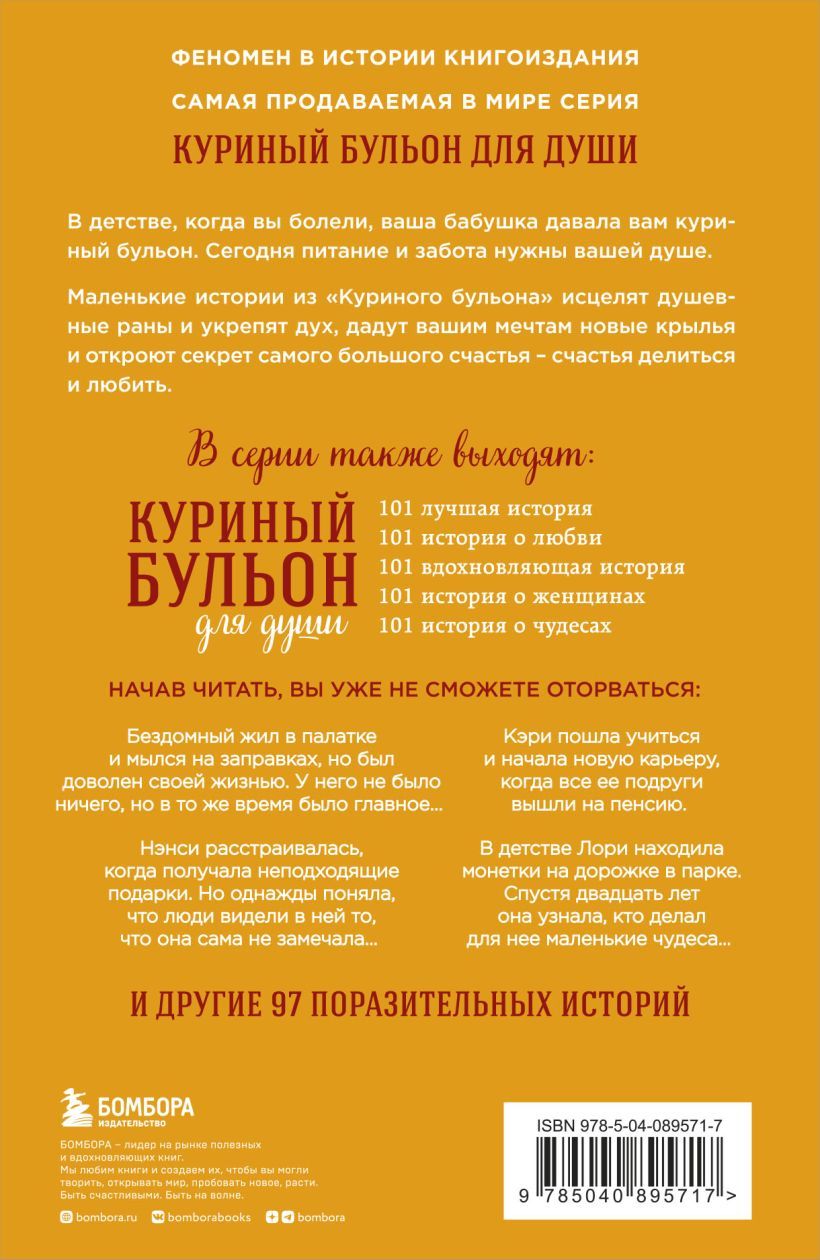Bērnībā, kad saslimuši, vecmāmiņa tev deva vistas buljonu. Šodien jūsu dvēselei ir vajadzīga barība un aprūpe. Mazie stāsti no "Vistas buljona" - dziedinās jūsu dvēseles brūces un stiprinās jūsu garu, piešķirs jūsu sapņiem jaunus spārnus un atklās lielākās laimes noslēpumu - laimi dalīties un mīlēt.