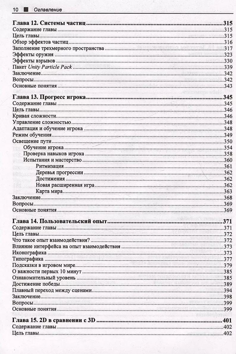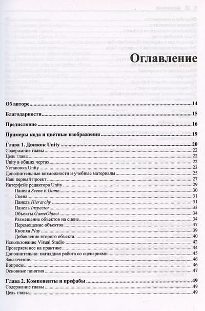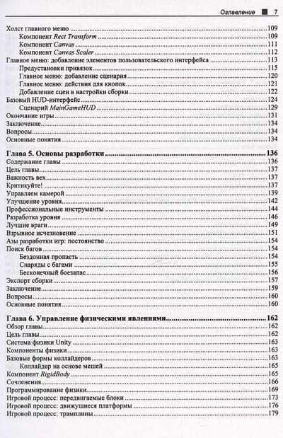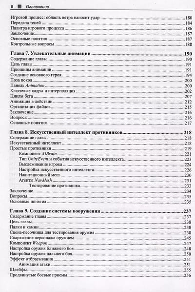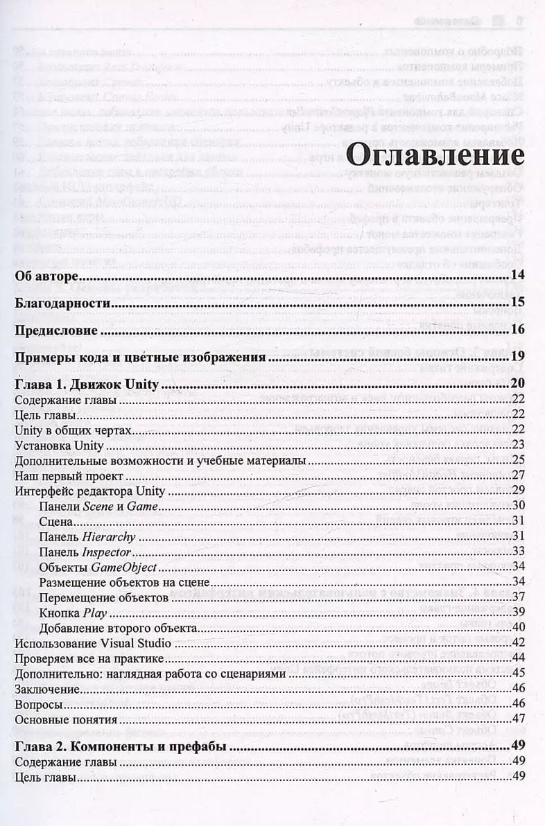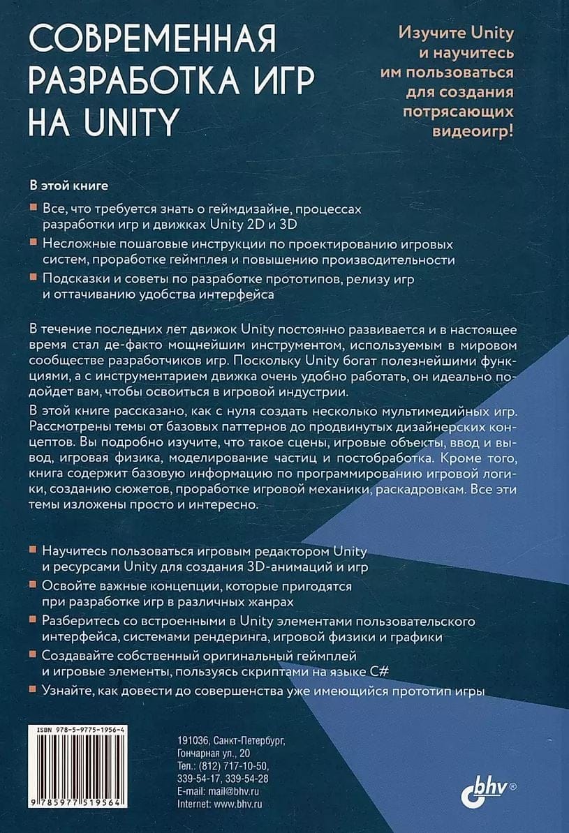 Pamata grāmata par Unity spēļu dzinēju 2D un 3D spēļu izstrādei C# valodā, izmantojot īpašus skriptus un bibliotēkas. Tiek aplūkoti spēļu programmēšanas pamatjautājumi: prototipu veidošana, vizuālo efektu radīšana, fizikas izstrāde, interfeisa dizains, programmas veiktspējas un reaģēšanas spēju uzlabošana. Uzmanība tiek pievērsta Unity spēļu dzinēja specifikai, spēļu sagatavošanai izdošanai, darbam ar C# skriptiem, lietojamībai, spēļu prototipu izstrādei un uzlabošanai.