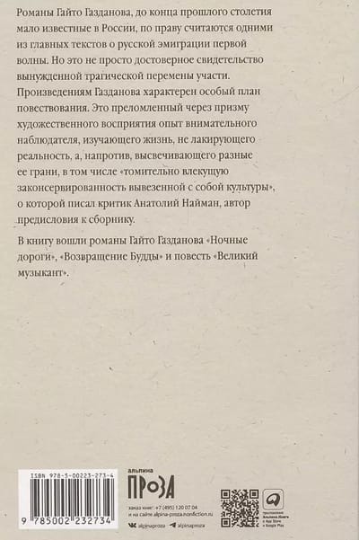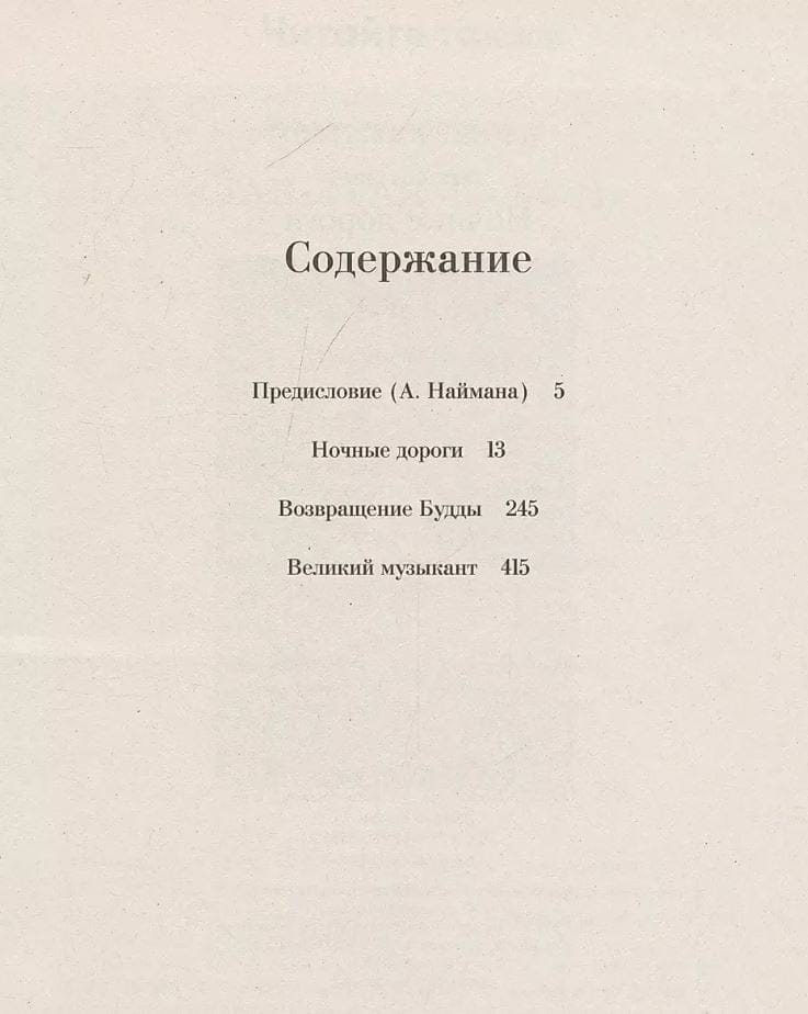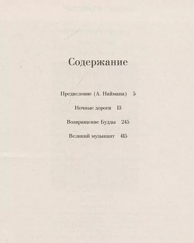 Grāmatā iekļauti Gaito Gazdanova romāni "Nakts ceļi", "Budas atgriešanās" un stāsts "Lielais mūziķis".