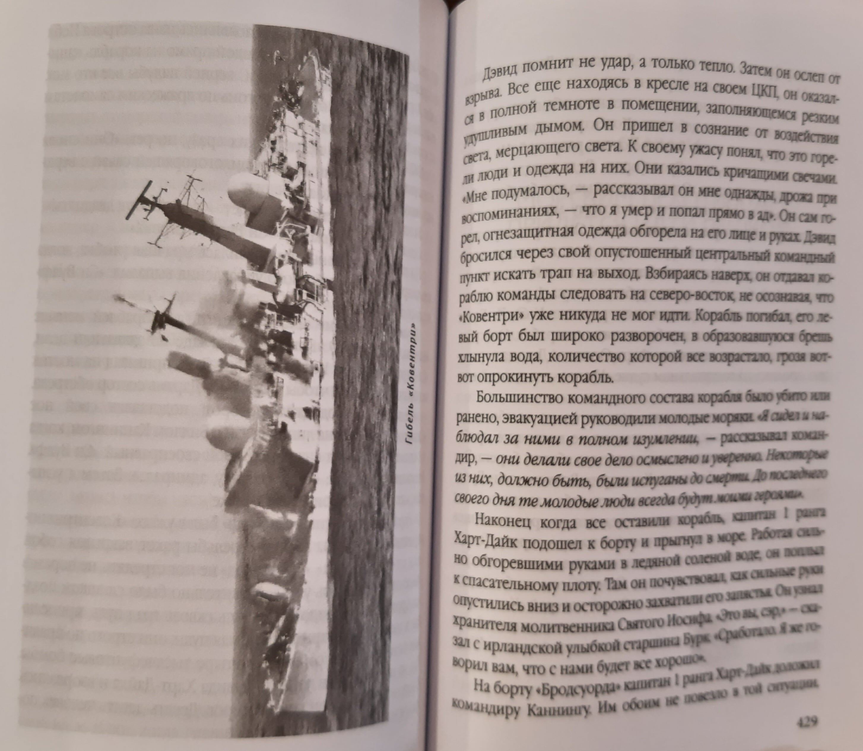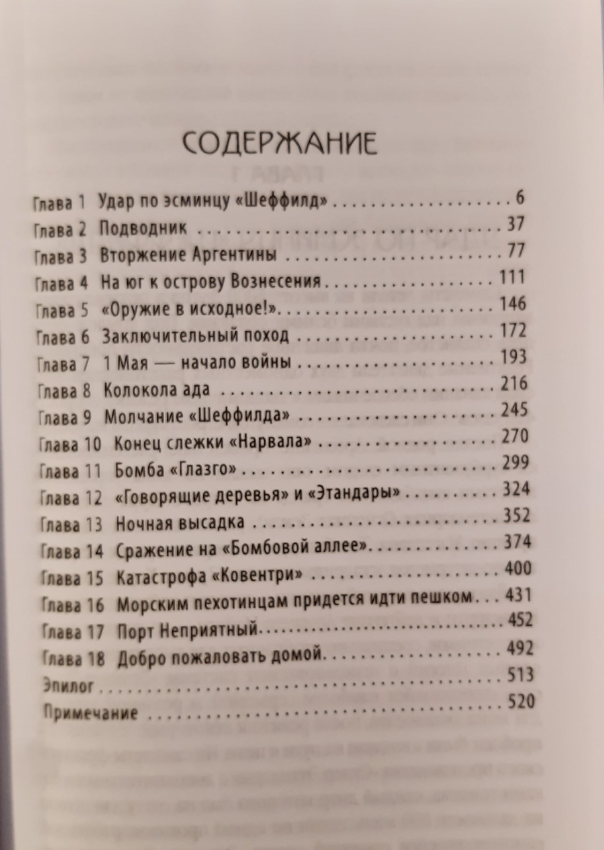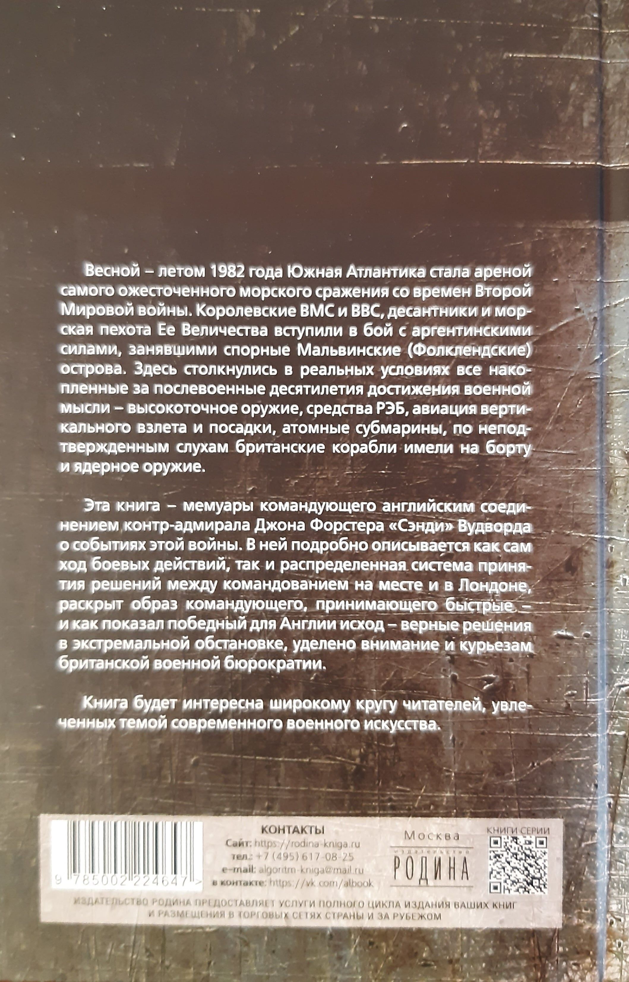 1982. gada pavasarī un vasarā Atlantijas okeāna dienvidu daļā norisinājās sīvākā jūras kauja kopš Otrā pasaules kara. Viņas Majestātes Karaliskās karaļvalsts kara flote un gaisa spēki, desantnieki un jūras kājnieki iesaistījās Argentīnas spēkos, kas okupēja strīdīgās Malvīnu (Folklendu) salas. Visi pēckara desmitgadēs uzkrātie militārās domas sasniegumi - augstas precizitātes ieroči, elektroniskās kaujas līdzekļi, vertikālās pacelšanās un nosēšanās aviācija, kodolzemūdenes, saskaņā ar neapstiprinātām baumām britu kuģiem uz klāja bija kodolieroči. Šī grāmata ir britu karaspēka savienojuma komandiera kontradmirāļa Džona Forstera ("Sandija" Vudvarda) atmiņas par kara notikumiem. Tajā detalizēti aprakstīta gan karadarbības gaita, gan sadalītā lēmumu pieņemšanas sistēma starp pavēlniecību uz vietas un Londonā, atklāts komandiera tēls, ātri pieņemot - un, kā parādīja Anglijas uzvaras iznākums, - pareizos lēmumus ekstrēmā situācijā, pievērsta uzmanība britu militārās birokrātijas kurioziem. Grāmata būs interesanta plašam lasītāju lokam, kurus aizrauj mūsdienu militārās mākslas tematika.