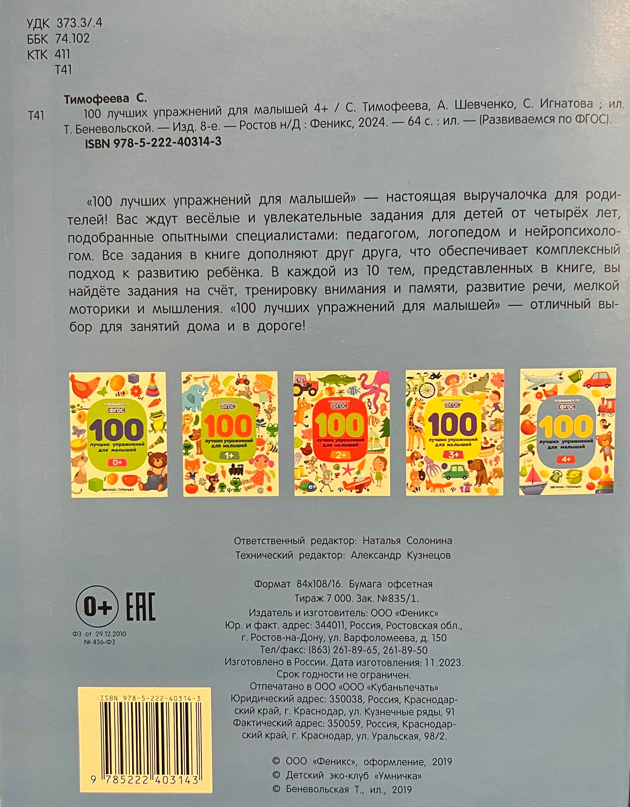 100 labāko vingrinājumu mazuļiem — īsts glābiņš vecākiem. Jūs atradīsiet jautrus un aizraujošus vingrinājumus bērniem no četru gadu vecuma, kurus atlasījuši pieredzējuši speciālisti: skolotājs, logopēds un neiropsihologs. Visi uzdevumi grāmatā viens otru papildina, kas nodrošina vispusīgu pieeju bērna attīstībai. Katrā no 10 grāmatā aplūkotajām tēmām atradīsiet uzdevumus skaitīšanai, uzmanības un atmiņas trenēšanai, runas attīstībai, sīkajai motorikai un domāšanai. 100 labākie vingrinājumi bērniem — lieliska izvēle vingrinājumiem mājās un ceļā.