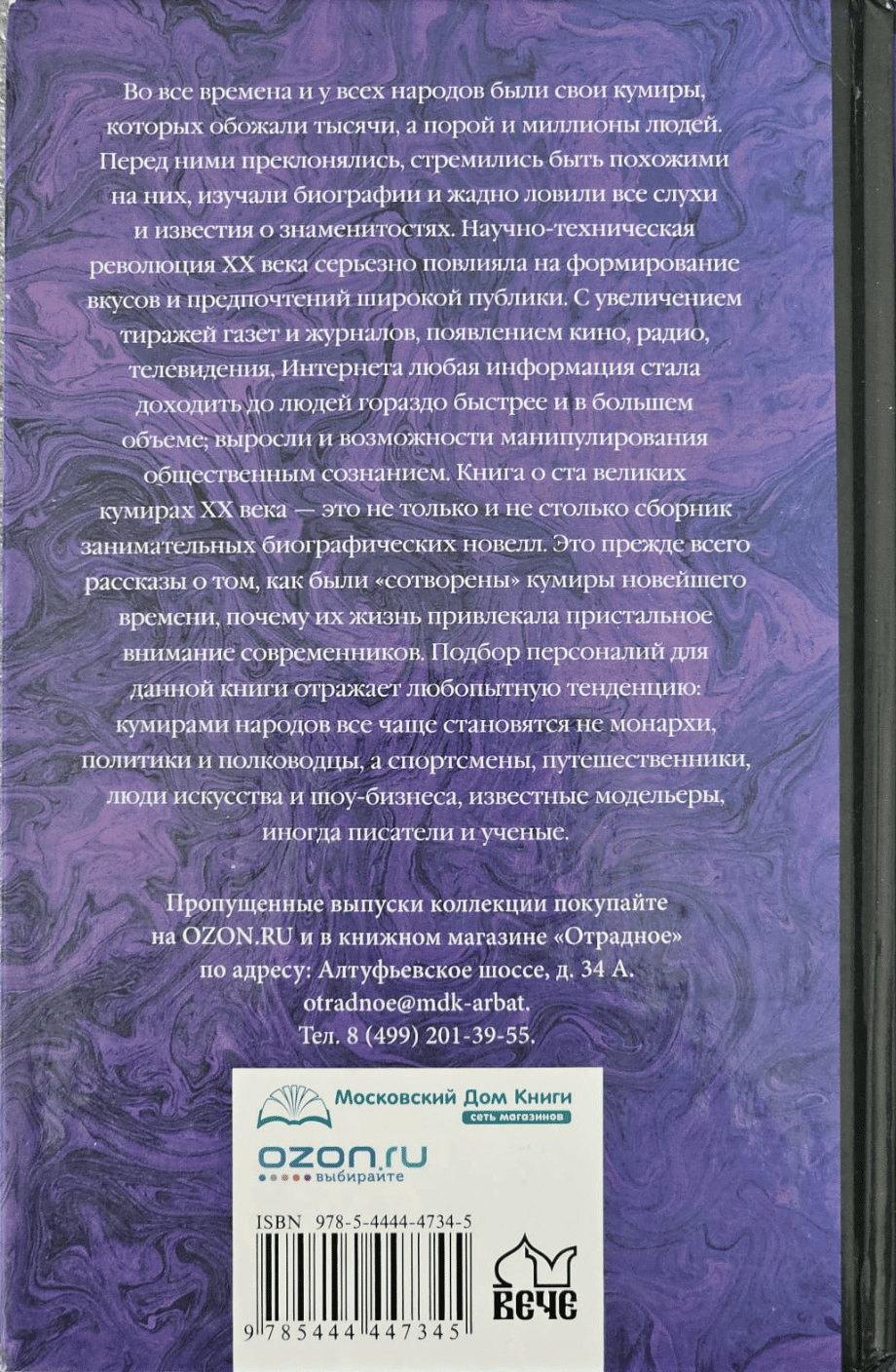 Visos laikos un visās tautās pastāvēja elki, kurus pielūdza tūkstošiem, un dažreiz pat miljoniem cilvēku. Tos pielūdza, cilvēki vēlējās tiem līdzināties, tika pētītas biogrāfijas un dedzīgi tvēra visas baumas un ziņas par slavenībām. 20. gadsimta zinātniskā un tehnoloģiskā revolūcija nopietni ietekmēja plašas sabiedrības gaumes un preferenču veidošanos. Pieaugot laikrakstu un žurnālu tirāžai, parādoties kino, radio, televīzijai, internetam, jebkura informācija sāka sasniegt cilvēkus daudz ātrāk un lielākā apjomā; palielinājās arī iespējas manipulēt ar sabiedrības apziņu. Grāmata par simts lieliem 20. gadsimta elkiem ir ne tikai un ne tik daudz izklaidējošu biogrāfisku īso stāstu krājums. Tie, pirmkārt, ir stāsti par to, kā tika "radīti" mūsdienu elki, kāpēc viņu dzīve piesaistīja laikabiedru uzmanību. Personību izvēle šai grāmatai atspoguļo kuriozu tendenci: par tautas elkiem arvien vairāk kļūst nevis monarhi, politiķi un militārie vadītāji, bet gan sportisti, ceļotāji, mākslas un šovbiznesa cilvēki, slaveni modes dizaineri un dažreiz arī rakstnieki un zinātnieki.