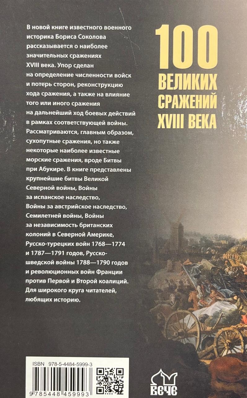 Slavenā militārā vēsturnieka Borisa Sokolova jaunā grāmata apraksta nozīmīgākās 18. gadsimta kaujas. Uzsvars tiek likts uz karaspēka skaita un upuru skaita noteikšanu abās pusēs, kaujas gaitas rekonstrukciju un katras kaujas ietekmes uz turpmāko karadarbības gaitu attiecīgajā karā izpēti. Grāmatā galvenokārt tiek aplūkotas sauszemes kaujas, bet iekļautas arī dažas no slavenākajām jūras kaujām, piemēram, Abukiras kauja. Grāmatā aprakstītas galvenās kaujas Lielajā Ziemeļu karā, Spānijas mantošanas karā, Austrijas mantošanas karā, Septiņgadu karā, Lielbritānijas koloniju neatkarības karā Ziemeļamerikā, Krievijas-Turcijas karos (1768.–1774. un 1787.–1791. gads), Krievijas-Zviedrijas karā (1788.–1790. gads) un Franču revolūcijas karos pret Pirmo un Otro koalīciju. Grāmata paredzēta plašam vēsturi mīlošu lasītāju lokam.