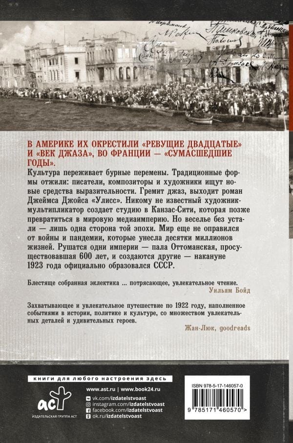 1922. gada notikumi ietekmēja visu divdesmito gadsimtu un turpina ietekmēt mūs arī simts gadus vēlāk. Impērijas krita. Oficiāli tika izveidota Padomju Savienība, un Musolīni Itālija kļuva par pirmo fašistisko valsti. T. S. Eliota "Neauglīgā zeme" pirmo reizi tika publicēta pilnībā. T. S. Eliota un Džeimsa Džoisa "Uliss". Aizliegums ASV bija sasniedzis savu kulmināciju, un, satricināta virknes skandālu, Holivudas kino industrija turpināja attīstīties. Radās jauns medijs - radio, un Lielbritānijā tika dibināta BBC. Pēckara sabiedrībā, kuru jau bija izmainījušas asiņainas traumas un pandēmija, pagātnes tikumi šķita vēl novecojuši; sākās "džeza laikmeta" sākums, kas vēstīja par "džeza laikmeta" sākumu.