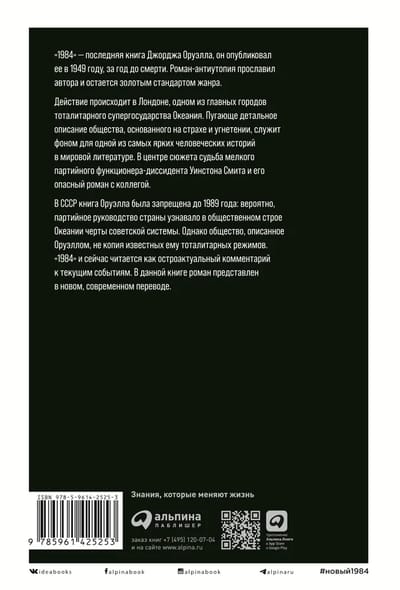 1984. gads ir Džordža Orvela pēdējā grāmata; viņš to publicēja 1949. gadā, gadu pirms nāves. Šis romāns-antiutopija padarīja autoru slavenu un joprojām ir žanra zelta standarts. Romāna darbība norisinās Londonā, vienā no totalitārās supervalsts Okeānijas galvenajām pilsētām. Šausminoši detalizēts bailēs un apspiestībā balstītas sabiedrības apraksts kalpo par fonu vienam no spilgtākajiem cilvēciskiem stāstiem pasaules literatūrā. Sižeta centrā ir sīka disidenta, partijas funkcionāra Vinstona Smita liktenis un viņa bīstamais romāns ar kolēģi. Orvela grāmatu PSRS aizliedza līdz pat 1989. gadam: partijas vadība Okeānijas sociālajā iekārtā, iespējams, saskatīja padomju sistēmas iezīmes. Tomēr Orvela aprakstītā sabiedrība nav viņam zināmo totalitāro režīmu kopija. "1984" pat tagad lasāms kā ļoti aktuāls komentārs par pašreizējiem notikumiem. Šī grāmata piedāvā romānu jaunā, mūsdienīgā tulkojumā.