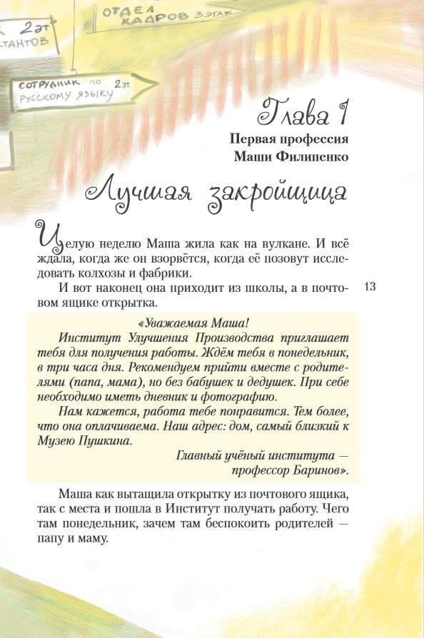 Trešās klases skolniece Maša Filipenko nemirs no pieticības. Un arī no radošu ideju trūkuma. Ne velti viņu aizveda uz Pilnveidošanas institūtu. Tur viņai kā meitenei ar "neapsviedīgu" apziņu ir jāuzlabo dažādi darbi: piemēram, jānoskaidro, kāpēc ateljē slikti strādā vai kur aiziet dārzeņu veikala augļi. Maša sparīgi apgūst profesijas un beigās pat palīdz kriminālizmeklēšanā, lai atrastu zēnu, kuru nolaupījis svešzemju karavadonis. Tieši tādus bērnus kā Maša iemīļoja šī stāsta autors Eduards Uspenskis. Jo viņš pats tāds bija.
