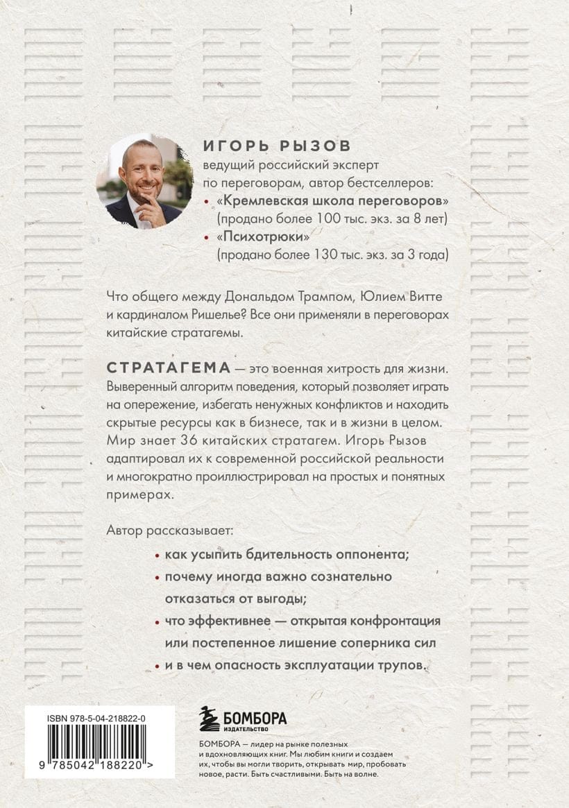 Stratēģe ir militārs triks dzīvei. Pārbaudīts uzvedības algoritms, kas ļauj saglabāt līderpozīcijas, izvairīties no nevajadzīgiem konfliktiem un atklāt slēptus resursus gan biznesā, gan dzīvē kopumā. Pasaule pazīst 36 ķīniešu stratēģijas. Krievu sarunu eksperts Igors Rizovs tās ir pielāgojis mūsdienu realitātei un ilustrējis ar daudziem vienkāršiem un skaidriem piemēriem.