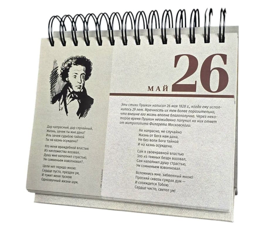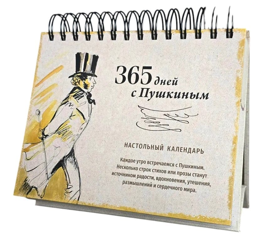 Aicinām jūs, lasītāj, nodzīvot gadu kopā ar Aleksandru Sergejeviču. Novietojiet mūsu kalendāru uz sava galda un pie rīta kafijas vai tējas tases atklājiet, kas padarīja šo dienu īpašu dzejnieka dzīvē, atcerieties bērnībā pazīstamas rindas un atklājiet tās, kuras, iespējams, vēl neesat lasījuši. Ļaujiet Puškina vārdiem rezonēt – un viņš pats būs ar jums. Viņš prata smieties un raudāt – tas nozīmē, ka viņš ir uzticams pavadonis jebkurā dienā. Jūs pavadīs dzejnieka zīmējumi, kā arī Nikolaja Kuzmina un Tatjanas Mavrinas zīmējumi. Šie mākslinieki izturējās pret Puškinu nevis kā pret bronzas klasiķi, bet gan kā pret dzīvu cilvēku. Viņu cieši saistītā ģimene reiz tika raksturota kā "mīlas trijstūris": Puškins bija trešais.