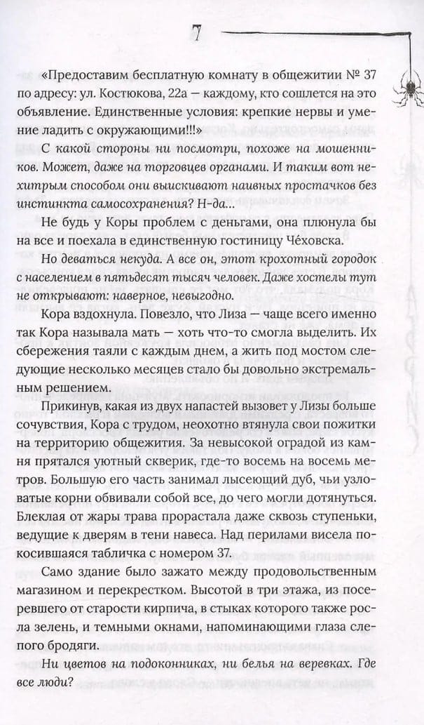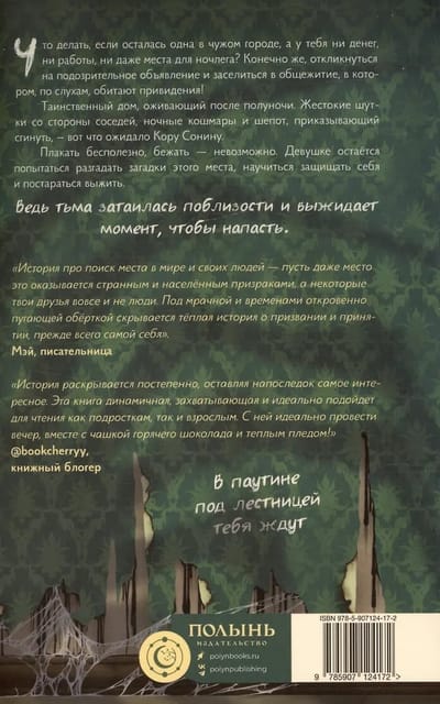 Ko darīt, ja esi viens svešā pilsētā, bez naudas, bez darba un pat bez vietas, kur gulēt? Protams, tu atbildi uz aizdomīgu sludinājumu un reģistrējies hostelī, par kuru klīst baumas, ka to spokojas. Noslēpumaina māja, kas atdzīvojas pēc pusnakts. Nežēlīgi kaimiņu joki, murgi un čuksti, kas liek pazust — lūk, kas gaidīja Koru Soninu. Raudāt ir bezjēdzīgi, bēgt nav iespējams. Meitenei jācenšas atšķetināt šīs vietas noslēpumus, jāiemācās sevi pasargāt un jācenšas izdzīvot. Galu galā tuvumā slēpjas tumsa, gaidot īsto brīdi, lai uzbruktu.