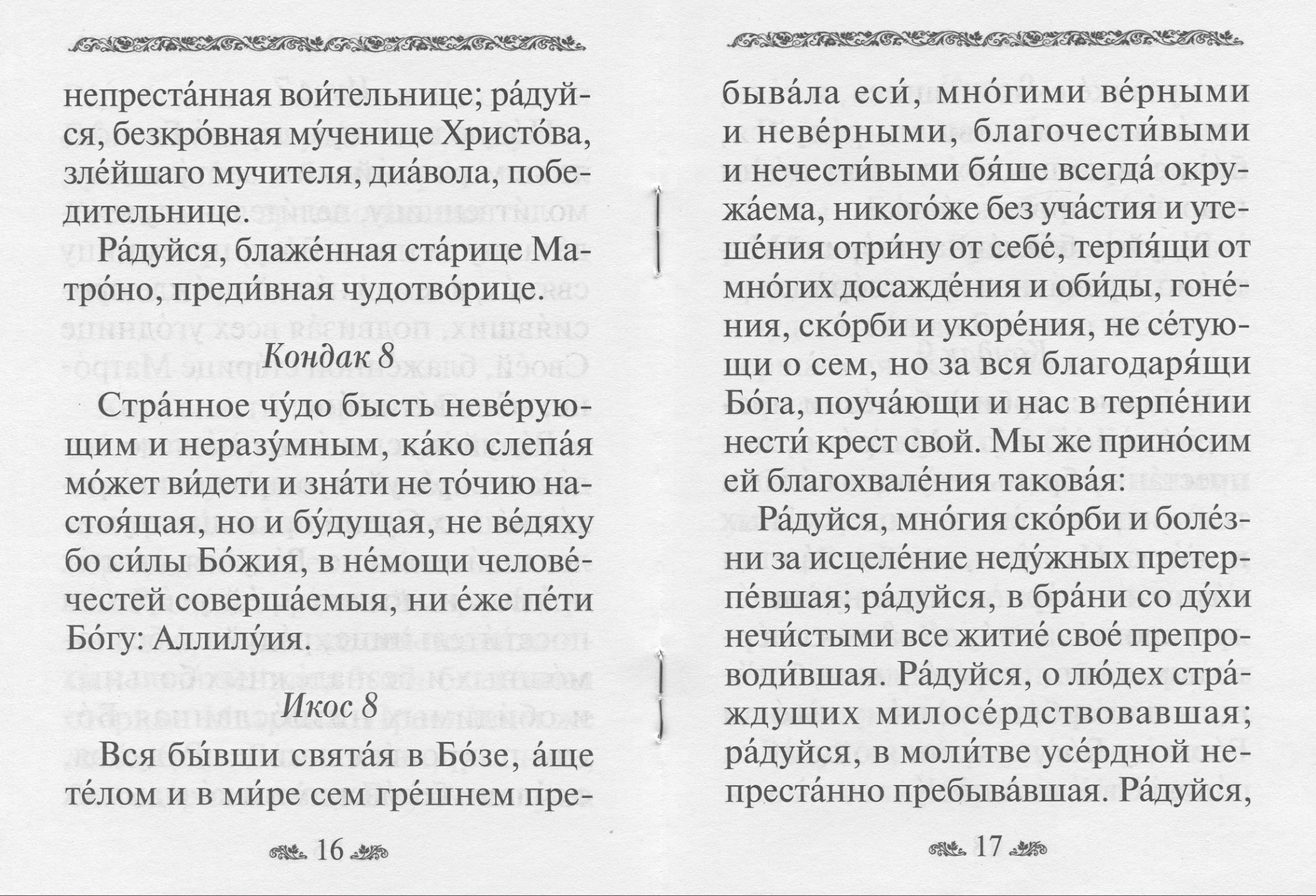 Brošūrā ir attēlots akatiķis Svētajai Svētītajai Maskavas Matronai, kas iespiests lielā civilā fontā.
