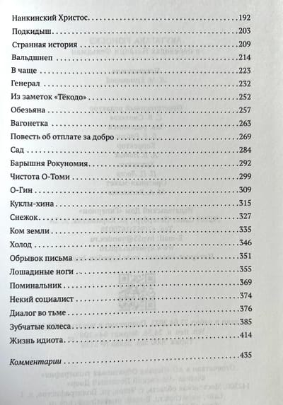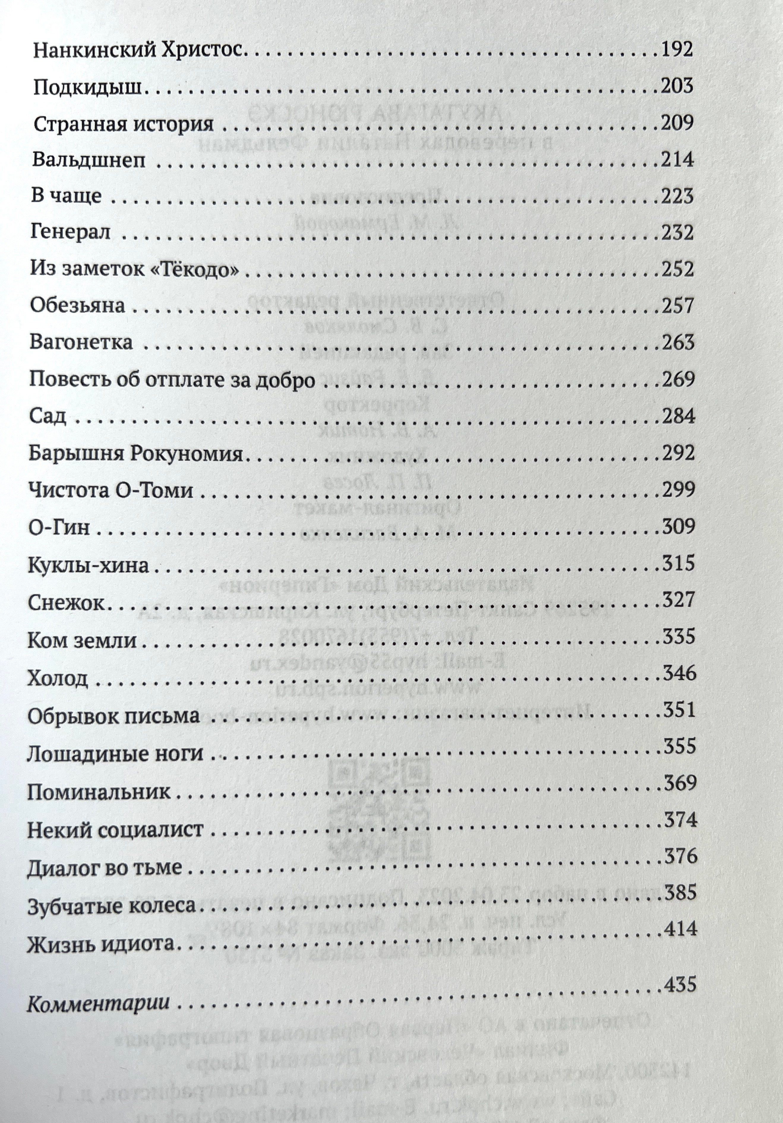 Šis izdevums ir izcilā 20. gadsimta sākuma japāņu rakstnieka atlasītu īso stāstu krājums. Akutagava Ryunosuke. Viņa teksti ir ārkārtīgi dažādi, un dažādos laikos tos tulkojuši dažādi tulki, taču šim krājumam bija tikai viens atlases kritērijs – visi grāmatas tulkojumi pieder slavenajai padomju japanoloģei, filoloģei, valodniecei, tulkotājai Natālijai Isajevnai Feldmanei, kurai šogad būtu apritējuši 120 gadi. Savas dzīves laikā viņa vairākkārt atgriezās pie Akutagawa darbu kolekcijas, kas tika publicētas 1936., 1959. un 1971. gadā, apgādājot ar viņas priekšvārdiem un komentāriem. Viņas tulkojumi ir tik labi, ka šķiet, ka Akutagava būtu rakstījusi krieviski. Taču lasītājs pats par to varēs pārliecināties, izlasot grāmatu.