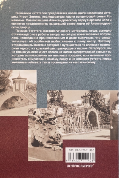Šī grāmata ir loģisks turpinājums I. V. Zimina iepriekš publicētajam darbam "Aleksandra pils Carskoje Selo". Koncentrēšanās uz Aleksandra parka vēsturi ar tā daudzajām celtnēm un paviljoniem ir motivēta ar to, ka parks un pils veido vienotu telpu imperatora lauku rezidences ietvaros, un viena vēstures izpēte, neņemot vērā otra vēsturi, ir nepiedienīga. Aleksandra parka vēsturei ir dziļākas saknes nekā Aleksandra pils vēsturei. Visi imperatori un imperatores, kas dzīvoja Carskoje Selo no 18. gadsimta sākuma, ar mīlestību un centību attīstīja savas rezidences un parkus. Rezultātā Aleksandra parkā radās kaprīza arhitektūras fantāziju un vēlmju saplūšana, atklājot ne tikai arhitektu talantu, bet arī Krievijas monarhu personīgo kaislību atspoguļojumu.