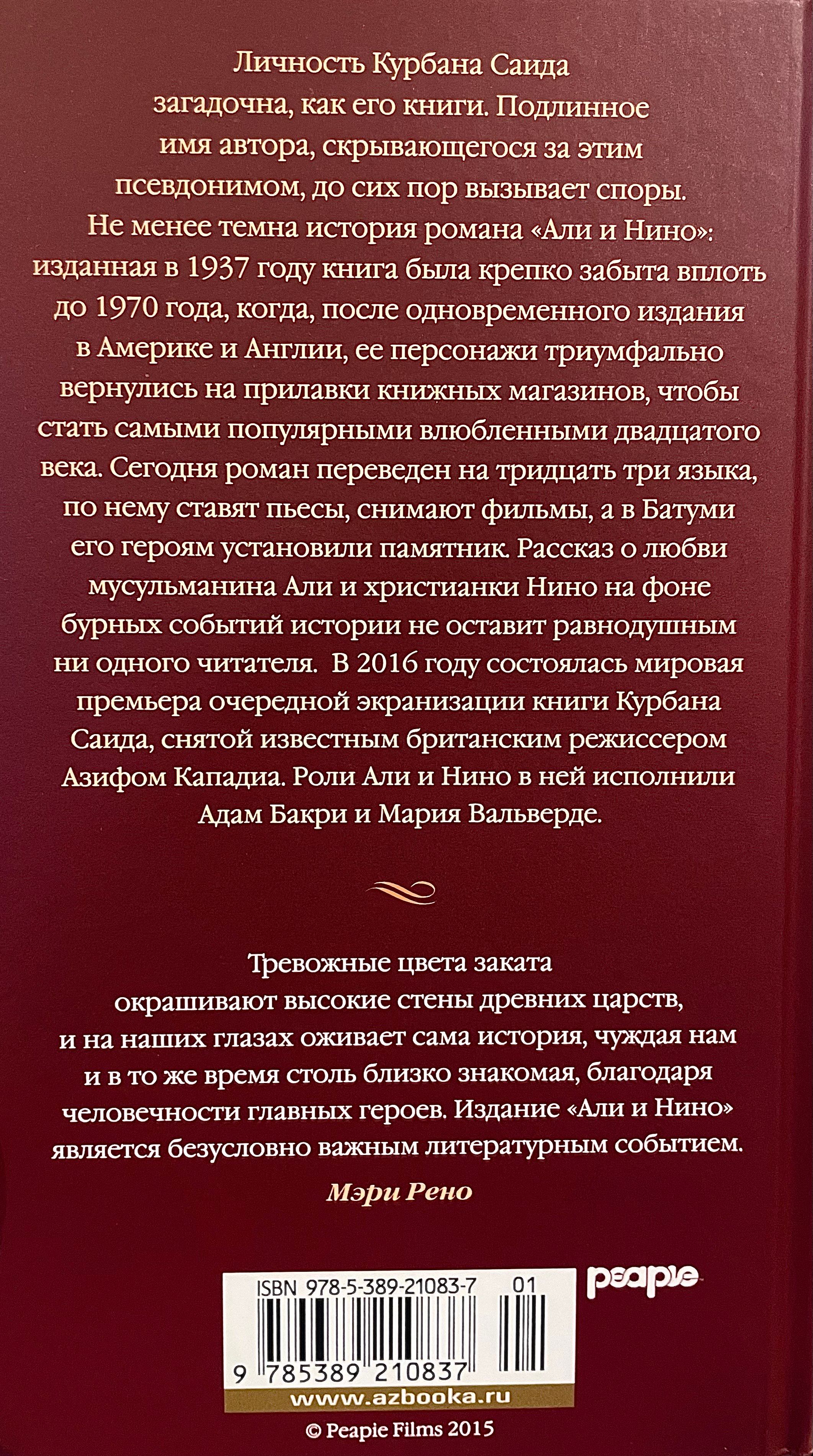Autora īstais vārds, kas slēpjas aiz pseidonīma “Kurban Said”, joprojām ir pretrunīgs. Viņa slavenais romāns "Ali un Nino" pirmo reizi tika publicēts 1937. gadā Vīnē. Ilgu laiku grāmata tika uzskatīta par pazudušu, un tikai 20. gadsimta 70. gados tika atklāts tās tulkojums angļu valodā. Grāmatas varoņi triumfāli atgriezās grāmatnīcu plauktos, kļūstot par vienu no slavenākajiem 20. gadsimta mīlošajiem pāriem. Mūsdienās romāns ir tulkots trīsdesmit trīs valodās, pēc tā motīviem ir iestudētas lugas un uzņemtas filmas, un Baku ir uzcelts piemineklis tā varoņiem.