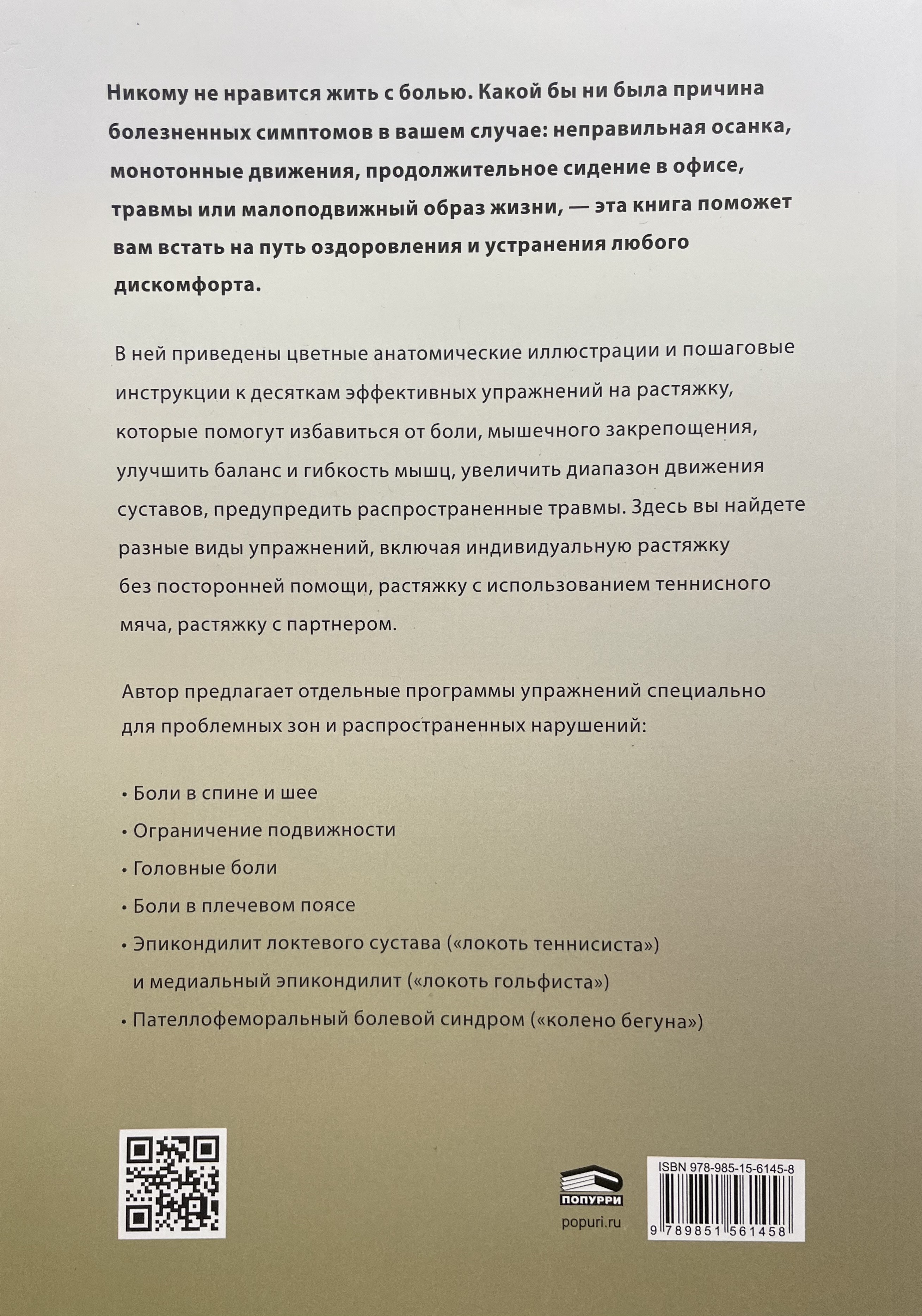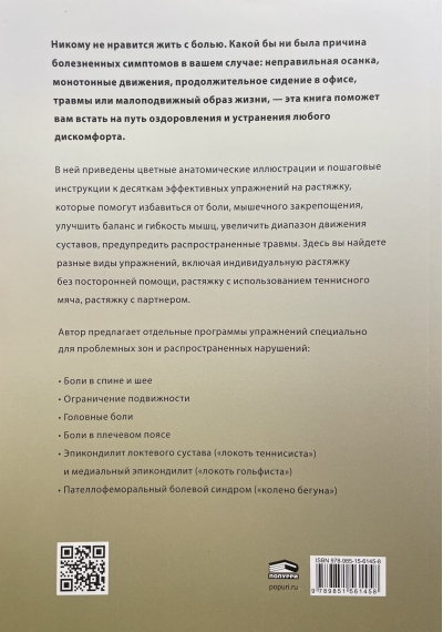 Nevienam nepatīk dzīvot ar sāpēm. Lai kāds arī būtu jūsu sāpīgo simptomu cēlonis — slikta stāja, atkārtotas kustības, ilgstoša sēdēšana birojā, traumas vai mazkustīgs dzīvesveids —, šī grāmata palīdzēs jums uzsākt atveseļošanās ceļu un novērst jebkādu diskomfortu.