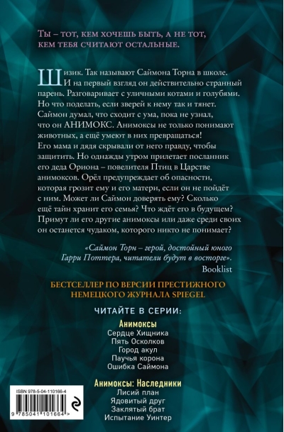Šizofrēnijs. Tā skolā sauc Saimonu Tornu. Un no pirmā acu uzmetiena viņš tiešām ir dīvains puisis. Viņš runā ar klaiņojošiem kaķiem un baložiem, bet ko viņš var darīt, ja viņam pievelk dzīvniekus? Saimons domāja, ka viņš kļūst traks, līdz atklāja, ka nav šizofrēnijs — viņš ir animokss. Animoksi ne tikai saprot dzīvniekus, bet pat var pārveidoties par tiem! Viņa māte un tēvocis no viņa slēpa patiesību. Bet kādu rītu ieradās vēstnesis no Putnu valstības, brīdinot par briesmām, kas draud viņam un viņa mātei. Vai Saimons var viņam uzticēties? Kas viņu sagaida nākotnē? Vai pārējie animoksi viņu pieņems, vai arī viņš paliks ekscentriķis, nesaprasts pat savējo vidū?