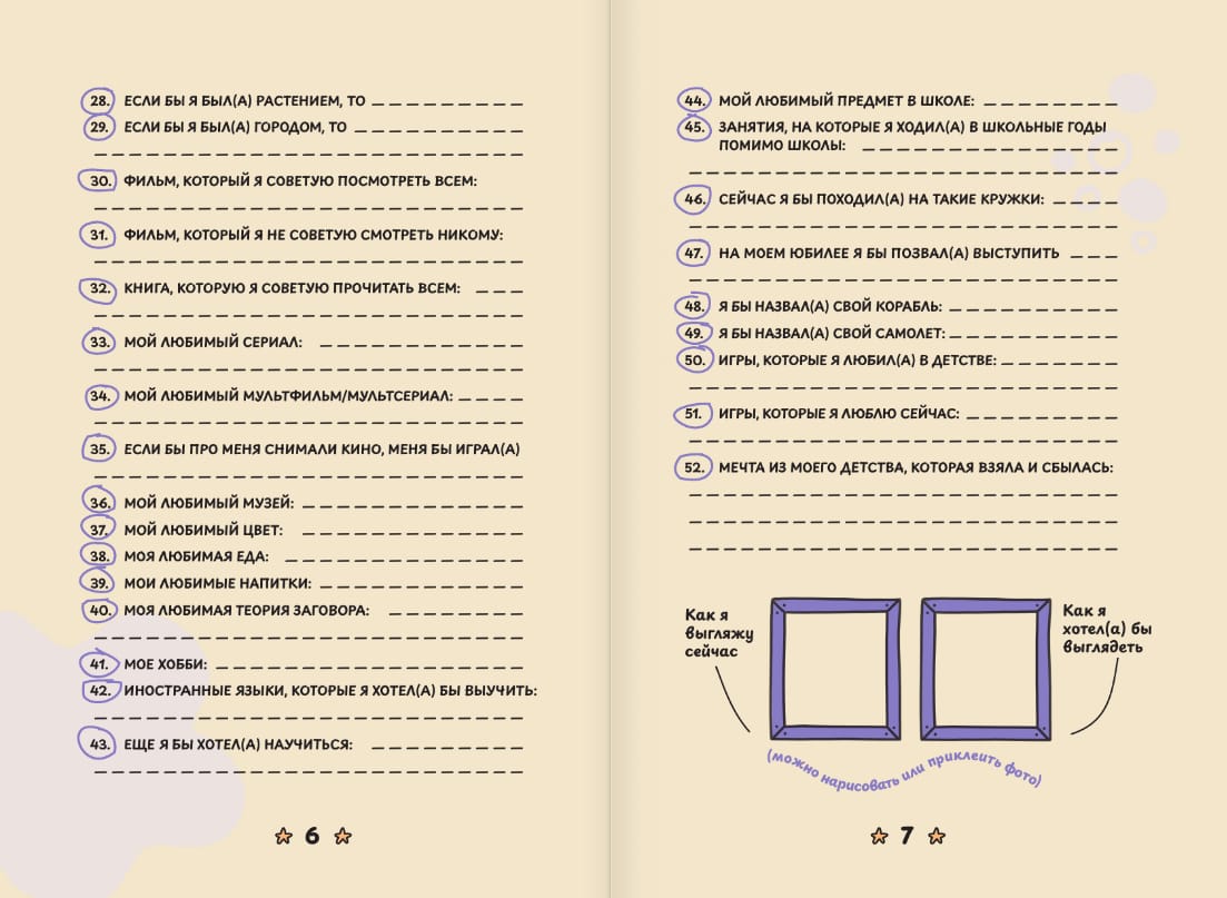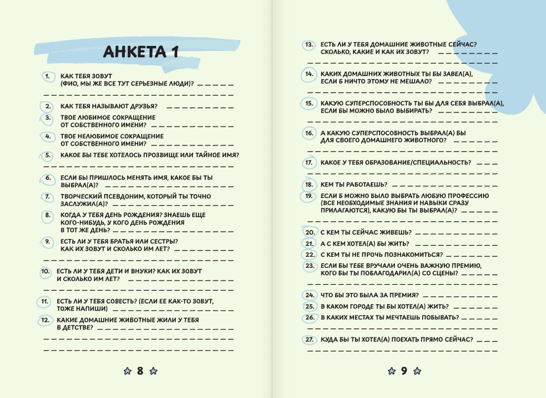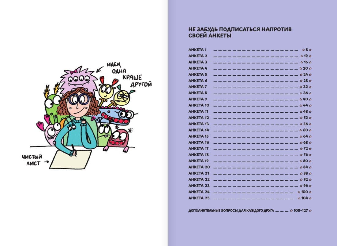 Jūs turat rokās vairāk nekā tikai jautājumu piezīmju grāmatiņu. Māksliniece Tatjana Zadorožnaja @fevrony aicina jūs doties patiesā ceļojumā personības, iztēles un draudzības pasaulē, kas piepildīta ar humoru, iedvesmu un bezrūpīgas bērnības silto nostalģiju.