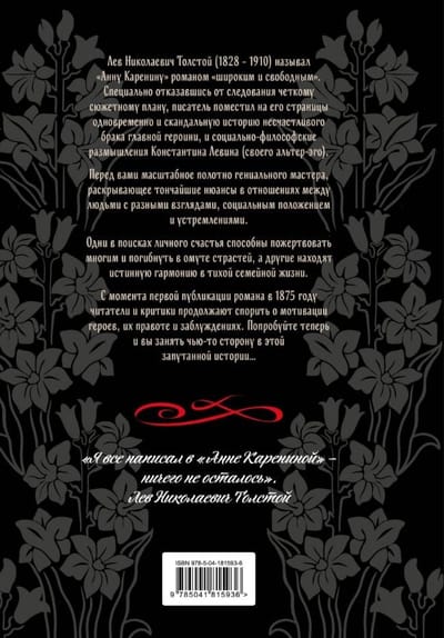 Ļevs Nikolajevičs Tolstojs (1828–1910) nosauca Annu Kareņinu par “plašu un brīvu” romānu. Apzināti atsakoties no skaidra sižeta plāna, rakstnieks tā lappusēs ievietoja gan skandalozo stāstu par galvenā varoņa nelaimīgo laulību, gan Konstantīna Levina (viņa alter ego) sociāli filozofiskās pārdomas.