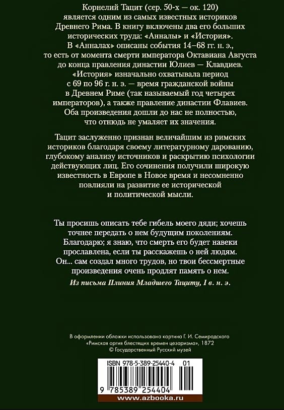 Kornēlijs Tacīts (ap 50. gadiem - ap 120. gadu) ir viens no slavenākajiem senās Romas vēsturniekiem. Divi no viņa lielajiem vēstures darbiem - Anālijas un Vēsture - ir iekļauti šajā grāmatā. "Anālos" aprakstīti notikumi no 14. līdz 68. gadam pēc Kristus dzimšanas, t. i., no imperatora Oktaviāna Augusta nāves līdz Jūlija-Klaudija dinastijas beigām. "Vēsture" sākotnēji aptvēra laika posmu no mūsu ēras 69. līdz 96. gadam - pilsoņu kara laiku Senajā Romā (tā saukto četru imperatoru gadu), kā arī Flāviju dinastijas valdīšanas laiku. Abi darbi līdz mums nav nonākuši pilnā apjomā, kas nemazina to nozīmi. Tacīts ir pelnīti atzīts par izcilāko romiešu vēsturnieku, pateicoties viņa literārajam talantam, dziļai avotu analīzei un darbojošos personu psiholoģijas atklāšanai. Viņa darbi kļuva plaši pazīstami Eiropā Jaunajos laikos un neapšaubāmi ietekmēja tās vēsturiskās un politiskās domas attīstību.