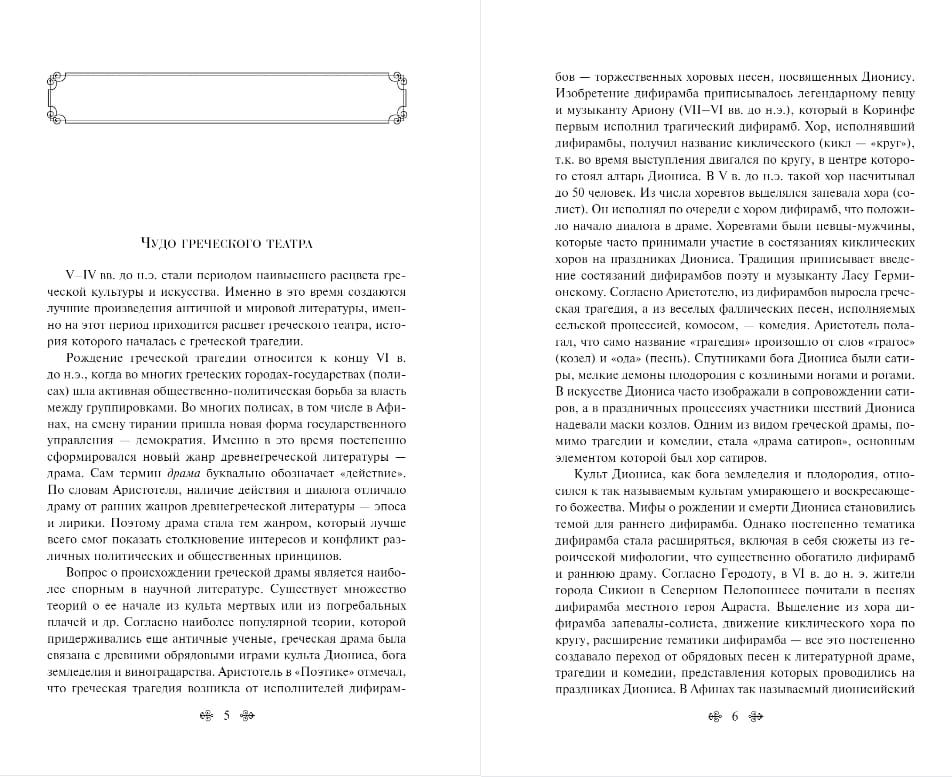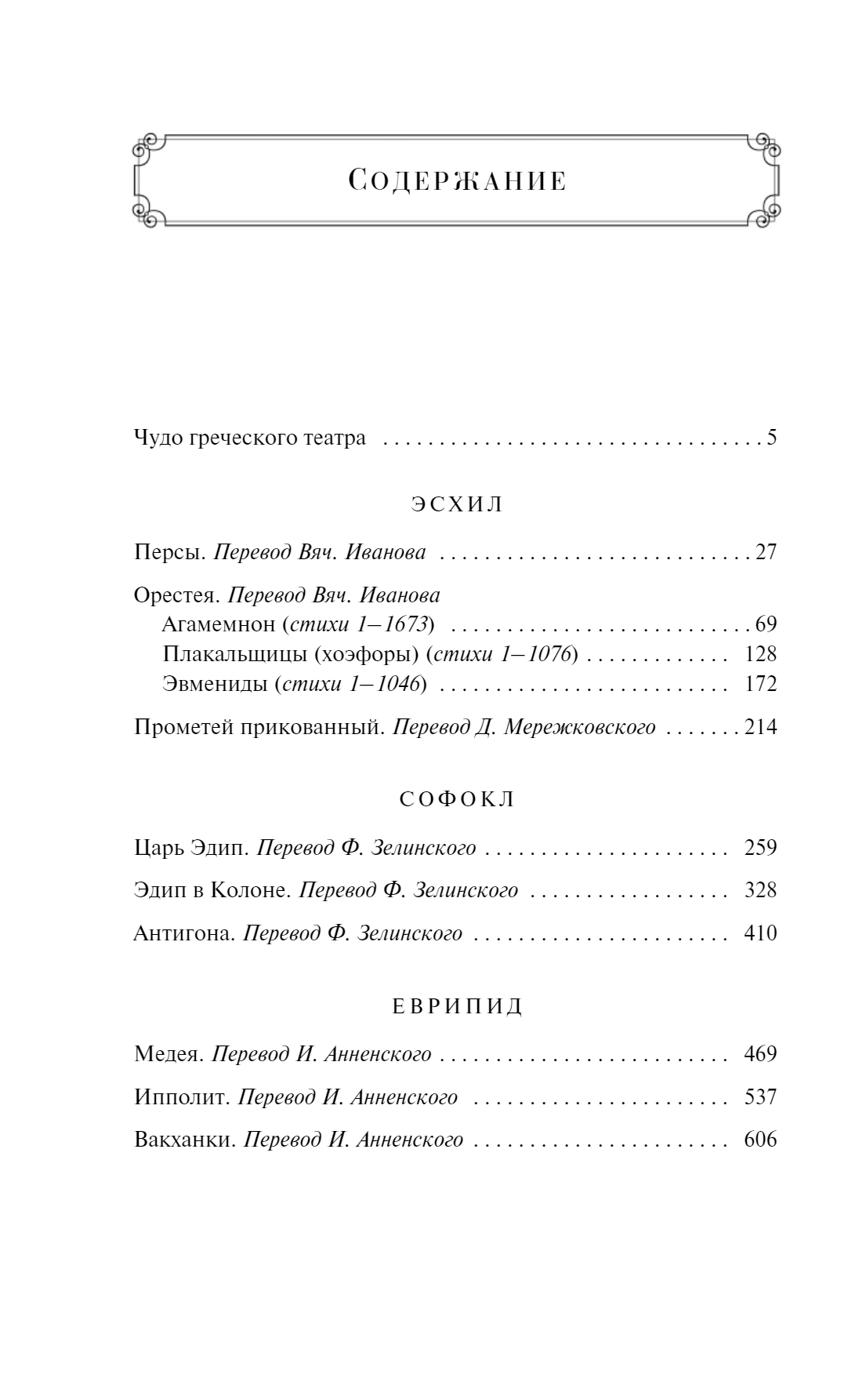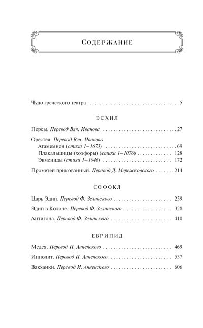 Kolekcijā atrodamas Aeshilus, Sofhocles un Euripides galvenās lugas: “Persians”, “Orestea”, “Prometheus chained”, “King Oedipus”, “Oedipus in Colon”, “Antigone”, “Medea”, “Hippolitus”, “Bacchanchi”.