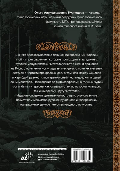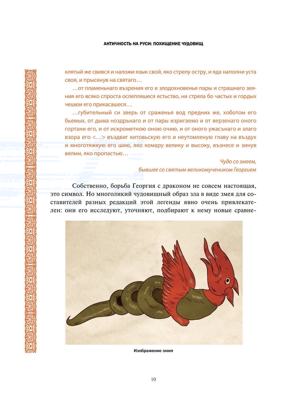 Grāmata stāsta par svešzemju briesmoņu nolaupīšanu un to pārvērtībām, kas notiek noslēpumainos krievu manuskriptos. Lasītājs uzzinās par pūķu dzīvi Krievzemē, par kāju parādīšanos pie medūzas un ehidnas, par pievilcīgiem zvēriņiem ar skaistu jaunavu iezīmēm, par to, kā starp Skillu un Haribdu tika ievietots trīsgalvains suns, hidra, valis un vesela virkne briesmoņu. Novērojumi par seno briesmoņu metamorfozēm var ieinteresēt gan kultūras vēstures speciālistus, gan plašu lasītāju loku.