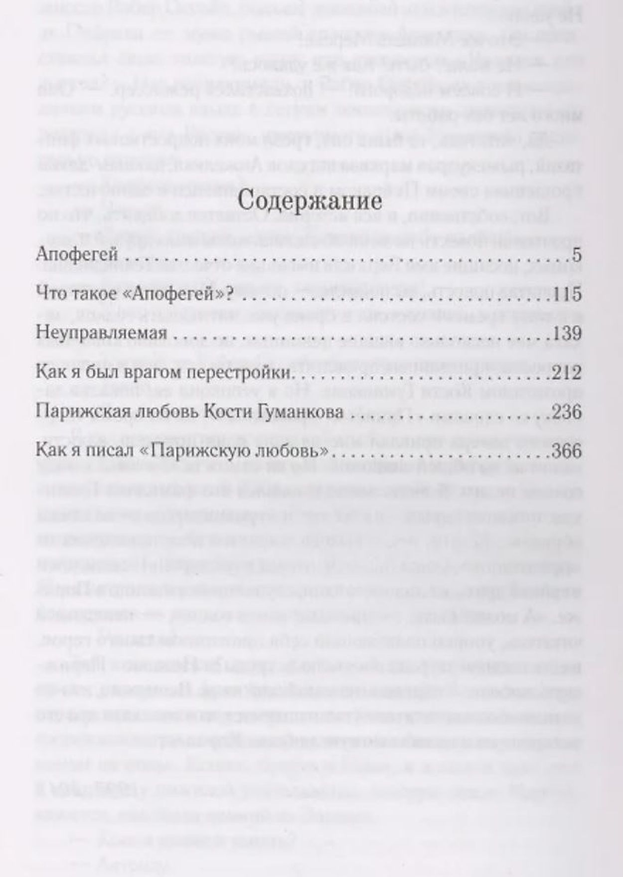 Krievu literatūras klasiķa Jurija Poļakova krājumā iekļauti divi no viņa slavenākajiem romāniem "Apothegeus" un "Kostjas Gumankova mīlestība Parīzē", kas vairāk nekā trīsdesmit gadus priecējuši lasītājus ar savu psiholoģisko dziļumu, oriģinalitāti un neatkārtojamo humoru. Autora esejas "Kas ir "Apothegiums"?" un "Kā es rakstīju "Parīzes mīlestību"" paver durvis uz rakstnieka radošo laboratoriju, stāstot par to, kā bestselleri tika iecerēti un sacerēti, desmitiem reižu pārpublicēti, ekranizēti, tulkoti daudzās valodās. Bet kino romāns "Nekontrolējams" ir darbs ar dramatisku likteni. Pavadošā eseja "Kā es biju perestroikas ienaidnieks" stāsta par Poļakovas darbu līdzautorībā ar E. I. Gabriloviču un L. Z. Eidliņinu pie pravietiskā Mosfilm projekta, ko varas iestādes slēdza "glasnost" kulminācijas laikā 1987. gadā. Galveno lomu necienīgajā filmā bija jāspēlē Irinai Muravjevai....