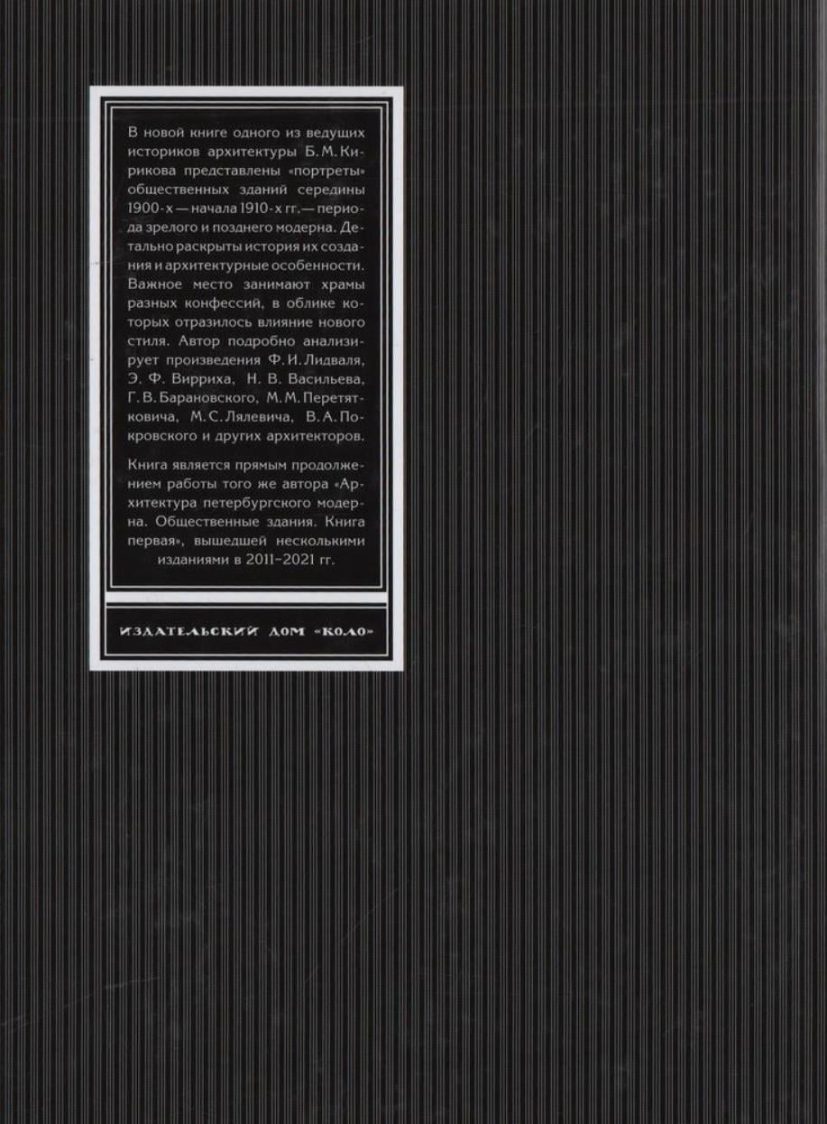 Šajā ievērojamā arhitektūras vēsturnieka B. M. Kirikova grāmatā ir attēloti sabiedrisko ēku "portreti" no 20. gs. vidus līdz 20. gs. 10. gadu sākumam — nobriedušā un vēlā jūgendstila periodam. Detalizēti tiek aplūkota to tapšanas vēsture un arhitektūras iezīmes. Nozīmīgu vietu ieņem dažādu konfesiju baznīcas, kuru izskats atspoguļo jaunā stila ietekmi. Autors rūpīgi analizē F. I. Ļidvala, E. F. Virriha, N. V. Vasiļjeva, G. V. Baranovska, M. M. Peretjatkoviča, M. S. Ļaļeviča, V. A. Pokrovska un citu arhitektu darbus. Inovatīvā jūgendstila līnijas attīstība tiek izsekota līdzās vēsturisko tradīciju atdzimšanai, kas mijiedarbojās ar jauno stilu.