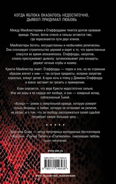 Makalisteri ir bagāti, spēcīgi un ārkārtīgi reliģiozi. Viņi finansē baznīcu celtniecību un uzskata, ka viņi ir vienīgie, kas tiks izglābti apokalipses laikā. Savukārt Stafordi, šķiet, kalpo velnam: viņi organizē rokkoncertus, vada naktsklubus un kazino. Kristija Makalistere zina, ka Stafordi ir ļauni un ļauni, taču viņu savādi pievelk tas, kā asi priekšmeti, neskatoties uz pieaugušo aizliegumiem, pievelk bērnus. Un viena nakts Demjena Staforda gūstā liks viņai sapņot par izlīgumu. Klans baidās, ka Kristija ticība nav pietiekami spēcīga. Vai varbūt viņas sirdī vispār nav ticības, un viņa ir nodevīga apse, tumsas savaldzināta.