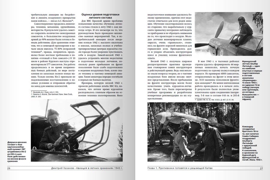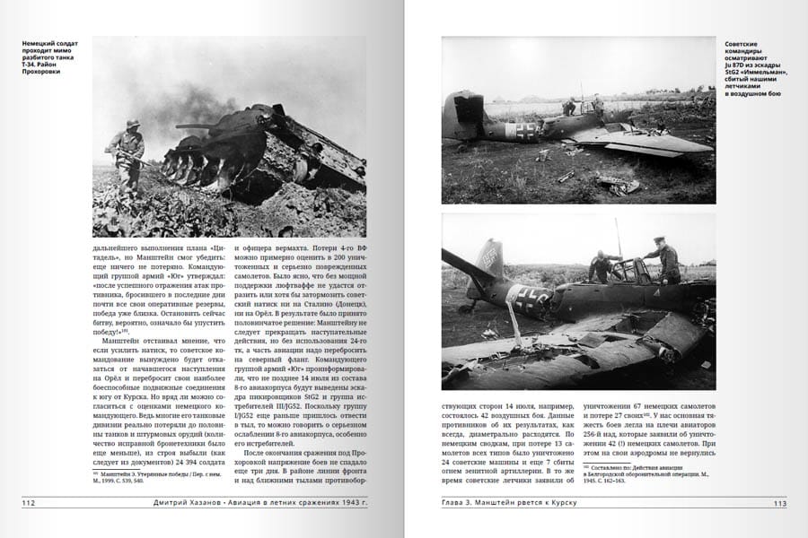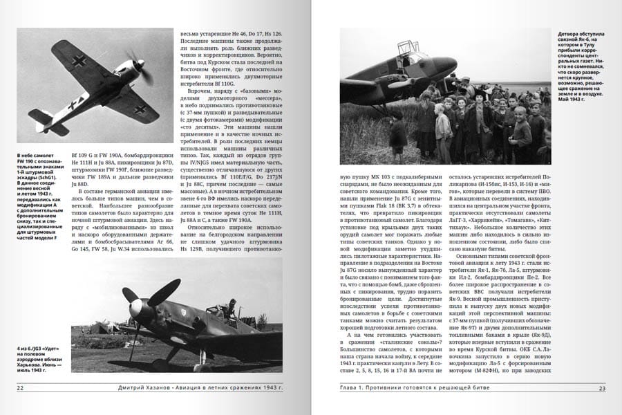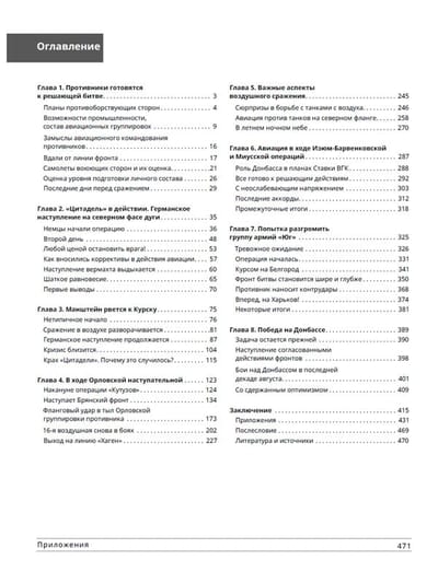 Šī ir pirmā grāmata krievu historiogrāfijā, kas veltīta visam gaisa kauju kompleksam, kas 1943. gada jūlijā-augustā norisinājās padomju-vācu frontes centrālajos posmos. To nozīmīgākā epizode bija Kurskas kaujas, kas ietver Centrālā un Voroņežas frontes aizsardzības operāciju pēc tam, kad vācieši uzsāka stratēģisko operāciju saskaņā ar plānu "Citadele", un tai sekojošās Sarkanās armijas uzbrukuma operācijas uz ziemeļiem un dienvidiem no tā dēvētā Kurskas vaļņa. Kā zināms, neraugoties uz spēcīgo triecienu, ko 5. jūlijā veica armiju grupu "Centrs" un "Dienvidi" spēki ar 6. un 4. gaisa flotes eskadriļu atbalstu, vāciešiem neizdevās pārraut aizsardzību un ielenkt padomju karaspēku. Tajā pašā laikā jau no pirmajām stundām notika sīvas un asiņainas kaujas ne tikai uz zemes, bet arī gaisā. Pēc tam, kad ienaidniekam izdevās atkrāsoties un apstāties, padomju pretuzbrukums tika uzsākts saskaņā ar plāniem "Kutuzovs", kurā 1943. gada 12. jūlijā pārgāja Rietumu, Brjanskas un Centrālā frontes karaspēks, un "Komandieris Rumjancevs", kurā no 1943. gada 3. augusta iesaistījās Stepju un Voroņežas frontes karaspēks. Grāmatā ir aplūkota cīņas gaita katrā atsevišķā operācijā un izdarīti secinājumi par to, kāpēc 1943. gada vasarā Luftwaffe nespēja izšķiroši ietekmēt cīņas gaitu un iznākumu uz zemes (atšķirībā no 1941. un 1942. gada). Darbu papildina daudzas fotogrāfijas, tabulas un diagrammas. Tā neapšaubāmi būs interesanta plašam lasītāju lokam, īpaši jauniešiem.