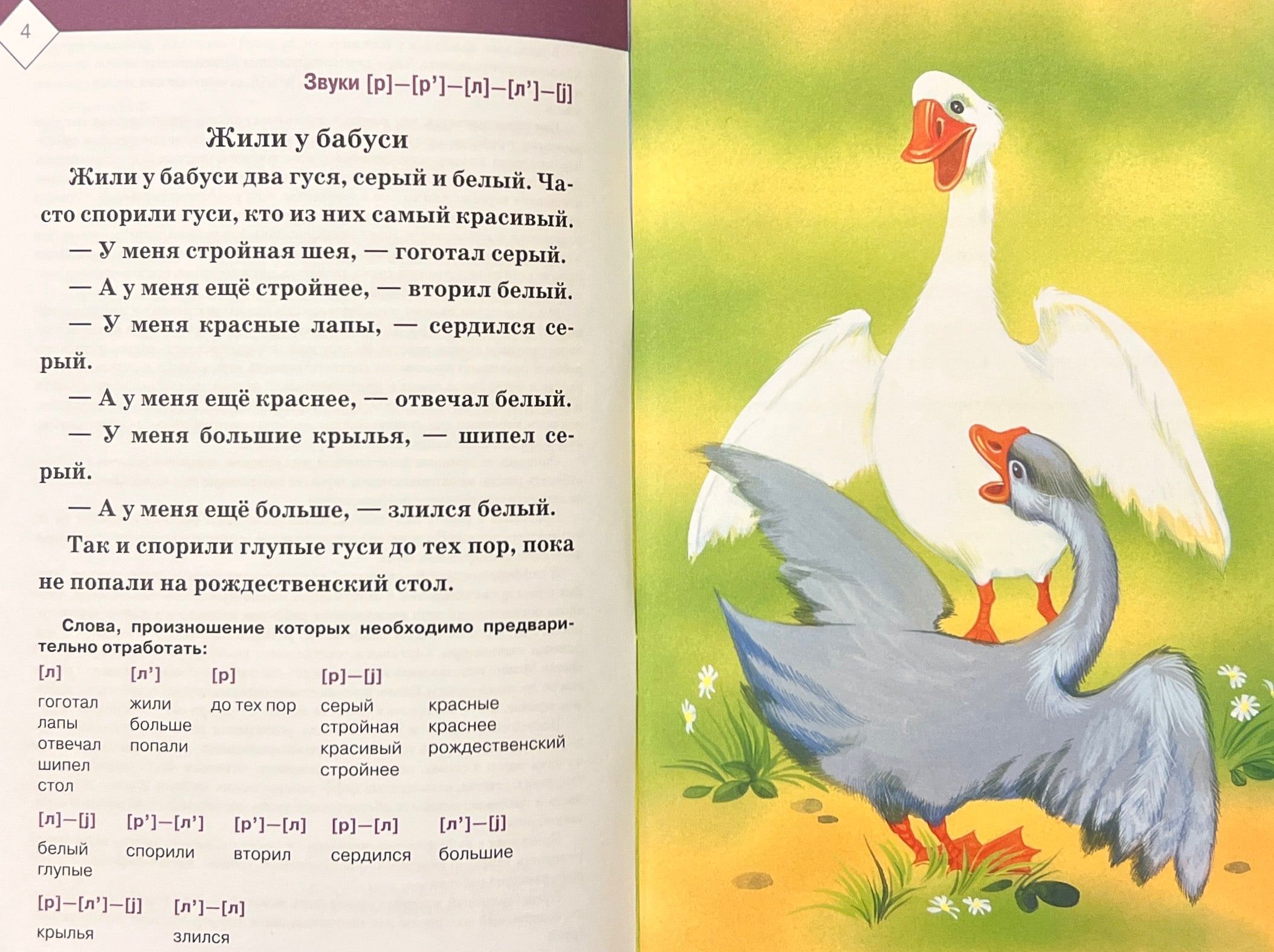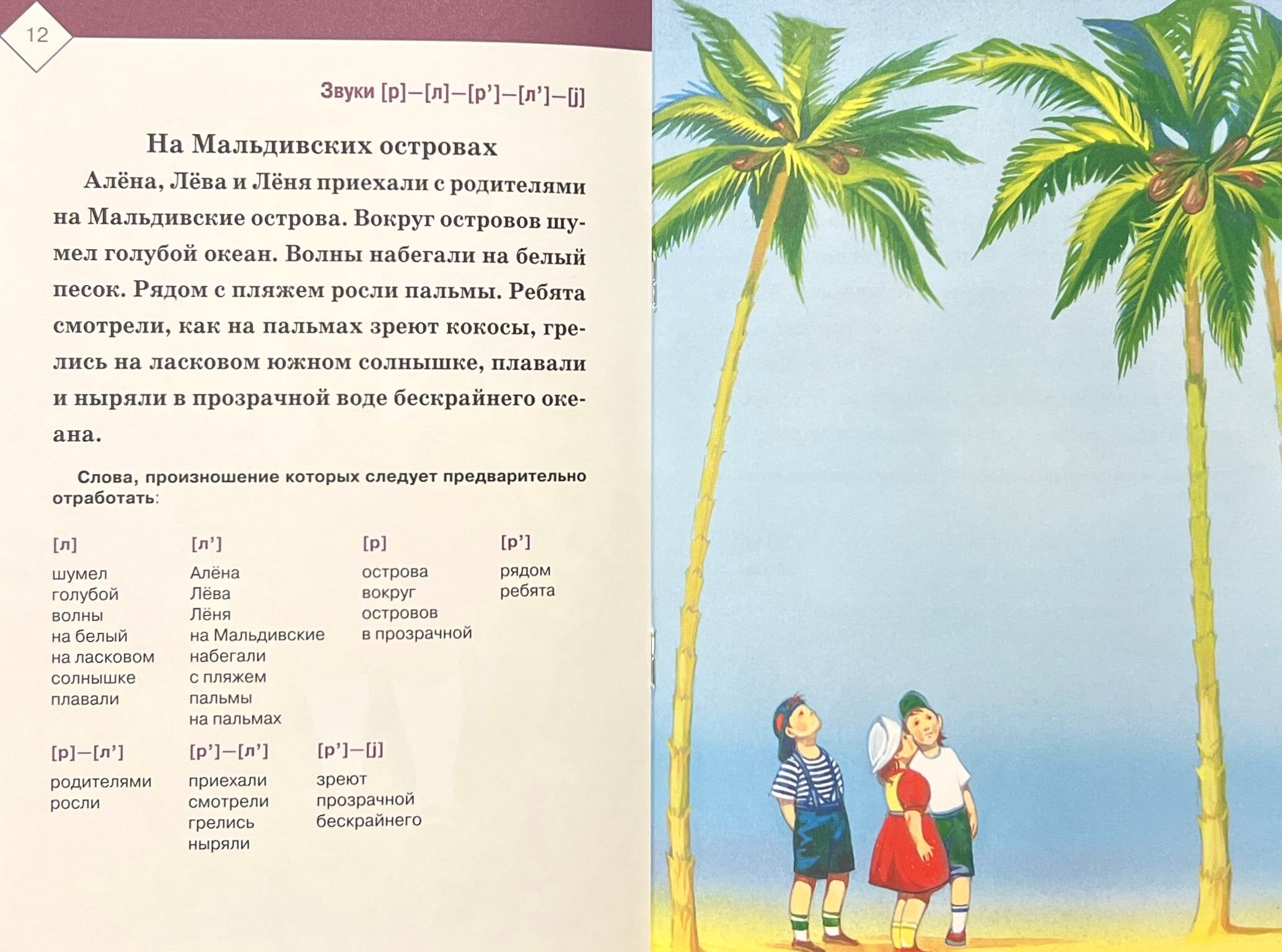 Rokasgrāmata iepazīstina ar attēliem un tekstiem skaņu automatizācijai un diferenciācijai [l], [l], [r], [p], [j]. Rokasgrāmata ļauj organizēt darbu ar bērnu dažādos veidos: atkārtojiet tekstu vienā teikumā pēc runas terapeita ar attēla atbalstu, iepriekš izdomājot ārpus teksta noņemto vārdu izrunu, nosaucot tekstu, balstoties uz attēlu vai to lasot, pareizi izrunājot vārdus ar sarežģītām skaņām. Uzrunāja bērnu pirmsskolas izglītības iestāžu un skolu runas terapijas punktu skolotājus-logus, bērnudārza skolotājus, bērnu vecākus ar runas attīstības problēmām.