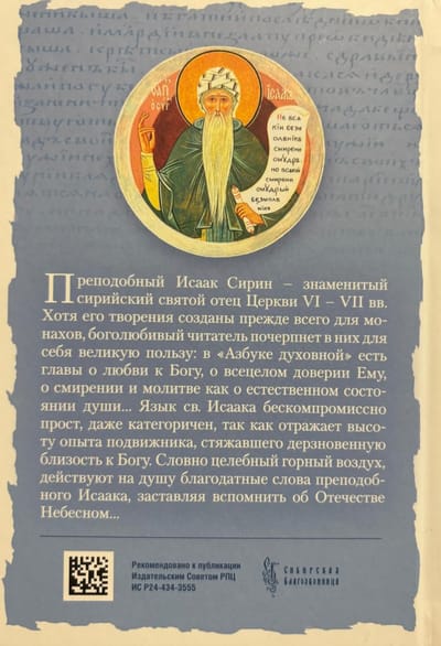 Dievbijīgam pareizticīgo lasītājam tiek piedāvāts fragmentu krājums — "Garīgais ābece" —, kas sastāv no svarīgākajām domām no slavenā sestā un septītā gadsimta svētā tēva, svētā Īzaka Sīrieša, "Askētiskajiem vārdiem". Citāti un piezīmes ir ņemtas no 1911. gada "Askētisko vārdu" krievu izdevuma, pamatojoties uz alfabētisko rādītāju, ko 1854. gada "Askētisko vārdu" izdevumam sastādīja Optinas vecākais svētais Makarijs.