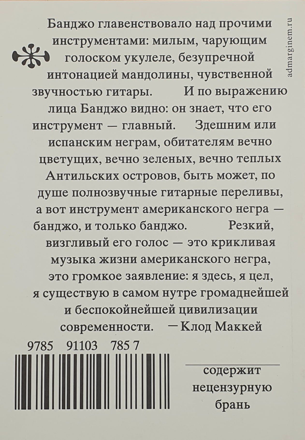 Jamaikā dzimušā amerikāņu rakstnieka Kloda Makkeja (Claude McKay, 1890-1948) romāns "Banjo" ir viens no darbiem, kas aizsāka Harlemas renesanses kustību. Makkeja autobiogrāfiskā romāna galvenais varonis, mūziķis Linkolns Agripa Dalijs, iesaukts par Bandžo, izklaidējas Marseļā suteneru - nabadzīgu melnādainu vīriešu, kas dzīvo prom no dzimtenes, meklējot baudu un piedzīvojumus, - sabiedrībā. Romāns ir pilns ar kosmopolītiskiem un neaizmirstamiem cilvēku tipāžiem, kurus autors sastapis savos ceļojumos pa pasauli. Šī grāmata ir gan dedzīgs manifests un rasu aizspriedumu nosodījums, gan arī dzīvs, spilgts krāsaino Marseļas klaidoņu, kuri nonāk komiskās situācijās, ikdienas dzīves apraksts.