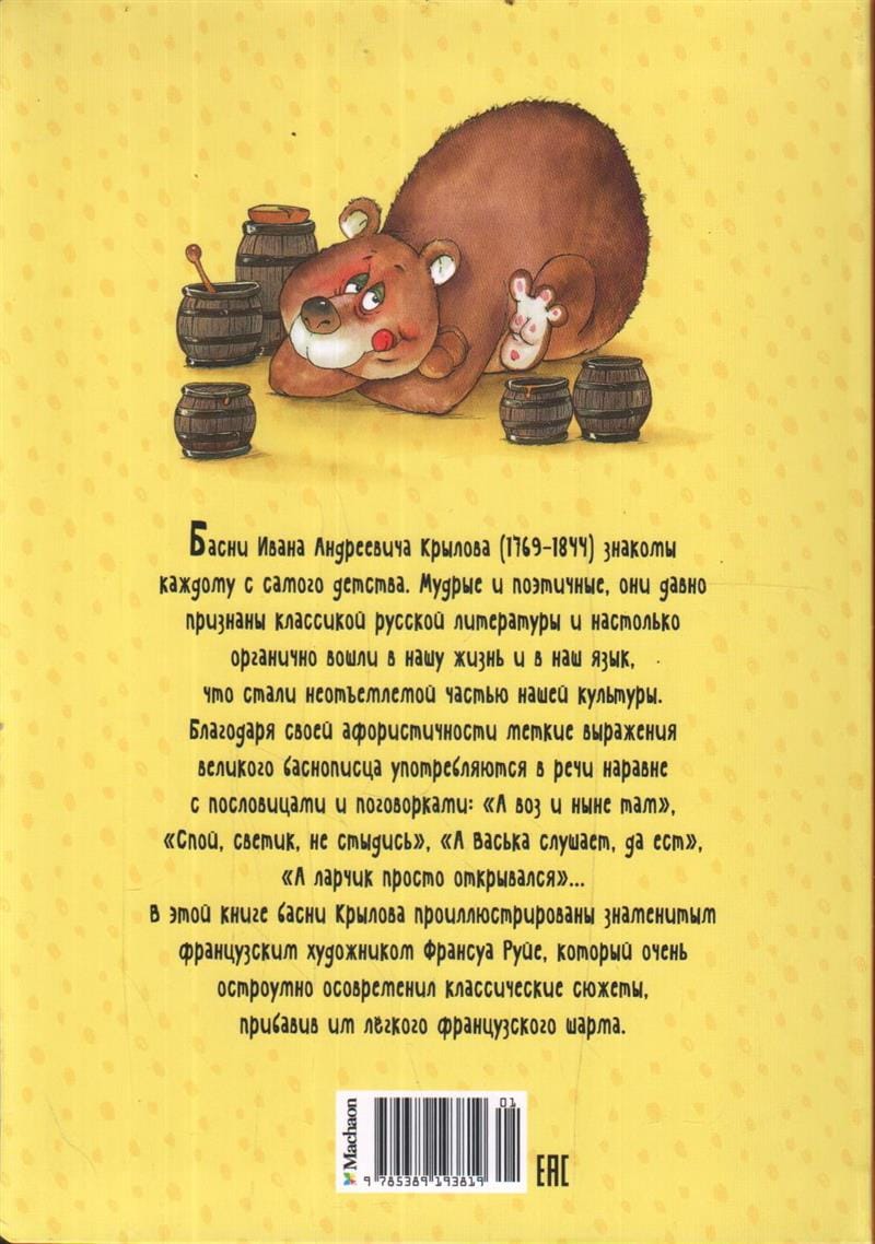Ivana Andrejeviča Krilova (1769-1844) pasakas ikvienam ir pazīstamas no bērnības. Gudras un poētiskas, tās jau sen ir atzītas par krievu literatūras klasiku un ir tik organiski ienākušas mūsu dzīvē un valodā, ka kļuvušas par neatņemamu mūsu kultūras sastāvdaļu. Pateicoties to aforistiski trāpīgajiem izteikumiem, dižā pasaku rakstnieka izteicieni tiek lietoti runā līdzvērtīgi sakāmvārdiem un sakāmvārdiem: "Un tā tas vēl ir", "Dziedi, gaismu, nekaunies", "Un Vaska klausās un ēd", "Un lāde vienkārši atvērta" ..... Šajā grāmatā Krilova pasakas ilustrējis slavenais franču mākslinieks Fransuā Ruilē, kurš ļoti asprātīgi modernizējis klasiskos stāstus, piešķirot tiem vieglu franču šarmu.
