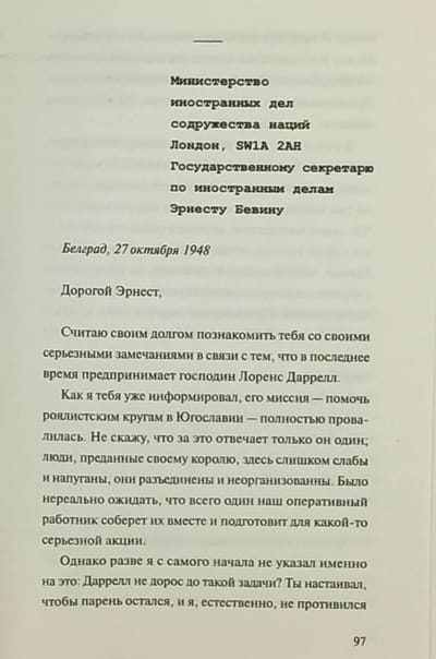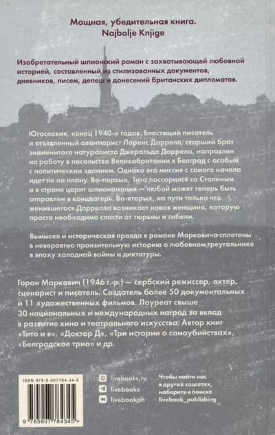 Dienvidslāvija, 40. gadu beigas. Geniālais rakstnieks un draņķīgs piedzīvojumu meklētājs Lorenss Darels, slavenā dabaszinātnieka Džeralda Darela vecākais brālis, tiek nosūtīts strādāt uz Lielbritānijas vēstniecību Belgradā ar īpašu politisku ēku. Tomēr viņa misija jau no paša sākuma nenorit saskaņā ar plānu. Pirmkārt, Tito ir sastrīdējies ar Staļinu, un valstī valda spiegu mānija - tagad ikvienu var nosūtīt uz koncentrācijas nometni. Otrkārt, tikko precētā Darrela ceļā parādās jauna sieviete, kuru vienkārši jāglābj no cietuma un nāves. Markoviča romānā fikcija un vēsturiskā patiesība savijas kopā, veidojot neticami trāpīgu stāstu par mīlas trīsstūri aukstā kara un diktatūras laikmetā.