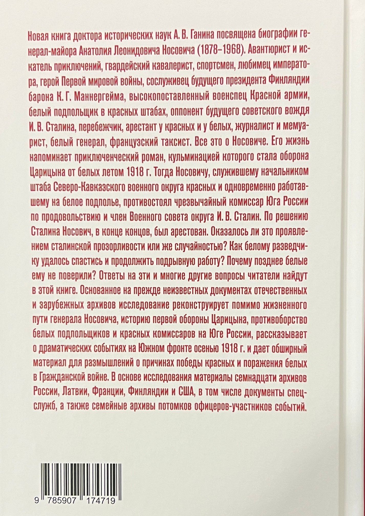 Vēstures zinātņu doktora A. V. Ganina jauna grāmata ir veltīta ģenerālmajora Anatolija Leonidoviča Nosoviča (1878–1968) biogrāfijai. Piedzīvojumu meklētājs un piedzīvojumu meklētājs, gvardes kavalērists, sportists, imperatora mīlulis, Pirmā pasaules kara varonis, topošā Somijas prezidenta kolēģis barons K.G. Mannerheims, augsta ranga militārais eksperts Sarkanajā armijā, baltais pazemes strādnieks sarkanajā štābā, topošā padomju līdera I.V. pretinieks. Staļins, pārbēdzējs, sarkano un balto gūsteknis, žurnālists un memuāru autors, baltais ģenerālis, franču taksists. Tas viss ir par Nosoviču. Viņa dzīve atgādina piedzīvojumu romānu, kura kulminācija bija Caricina aizstāvēšana no baltajiem 1918. gada vasarā. Pēc tam Nosovičs, kurš kalpoja par Ziemeļkaukāza sarkano militārā apgabala štāba priekšnieku un vienlaikus strādāja. par balto pagrīdi, iebilda Krievijas Dienvidu ārkārtējais komisārs pārtikas jautājumos un apgabala Militārās padomes loceklis I. IN. Staļins. Ar Staļina lēmumu Nosovičs galu galā tika arestēts. Vai tā bija Staļina tālredzības izpausme vai nejaušība? Kā baltajam izlūkdienesta darbiniekam izdevās aizbēgt un turpināt graujošo darbu? Kāpēc baltie viņam vēlāk neticēja? Uz šiem un daudziem citiem jautājumiem lasītāji atradīs atbildes šīs grāmatas lappusēs. Pamatojoties uz līdz šim nezināmiem pašmāju un ārvalstu arhīvu dokumentiem, pētījumā papildus ģenerāļa Nosoviča dzīves gaitām rekonstruēta Caricina pirmās aizsardzības vēsture, pagrīdes kaujinieku un sarkano komisāru konfrontācija Krievijas dienvidos, runāts par dramatiskus notikumus Dienvidu frontē 1918. gada rudenī un sniedz plašu materiālu pārdomām par sarkano uzvaras un balto sakāves iemesliem pilsoņu karā. Pētījuma pamatā ir materiāli no septiņpadsmit arhīviem Krievijā, Latvijā, Francijā, Somijā un ASV, tostarp specdienestu dokumenti, kā arī notikumos piedalījušos virsnieku pēcteču ģimenes arhīvi.