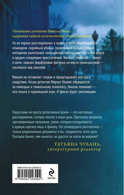 Detektīves asistente Nikola Evansa ir apsēsta ar savu vecāku pazušanas noslēpumu. Taču viņas pirmā izmeklēšana jaunajā nodaļā pārvēršas murgā: sērijveida slepkava, iesaukts par "Balto ziloni", metodiski nogalina policistus, pārvēršot upuru ķermeņa daļas ieročos turpmākiem noziegumiem. Katra slepkavība ir ķēdes posms, katra porcelāna figūriņa nozieguma vietā ir likuma izsmiekls.